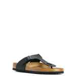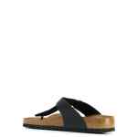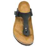 Black leather Birko-Flor thong sandals from Birkenstock featuring a round toe, a slip-on style, a branded insole, a backless design, a flat sole and a lightweight EVA sole. Gizeh thong sandals. Size and Fit – Regular fit