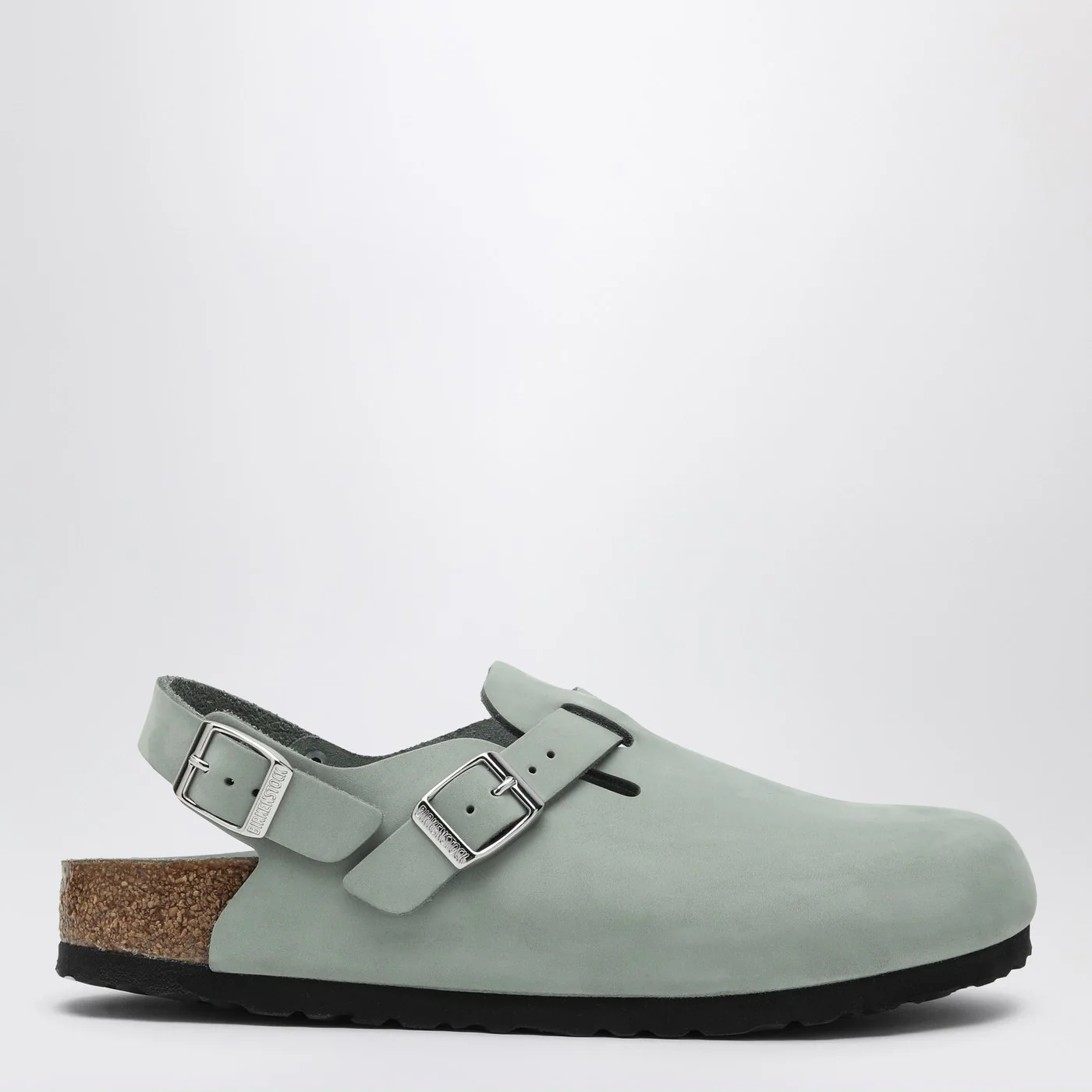 Sage coloured suede Birkenstock loafers featuring a round toe adjustable metal buckle strap adjustable heel strap anatomical cork and latex insole and EVA rubber sole.