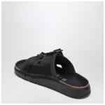 Birkenstock slipper in black leather and fabric, characterised by anatomical cork and latex footbed, double adjustable hook-and-loop fastener and rubber sole.
