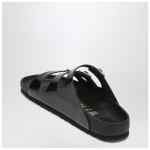 Black shiny leather Birkenstock slides characterized by a round toe, three adjustable straps with buckles, an anatomically shaped cork footbed, and an EVA rubber sole.