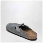 Birkenstock slipper made of grey suede leather, characterised by round toe, braided strap with adjustable buckle, anatomically shaped footbed made of cork and latex and EVA rubber sole.