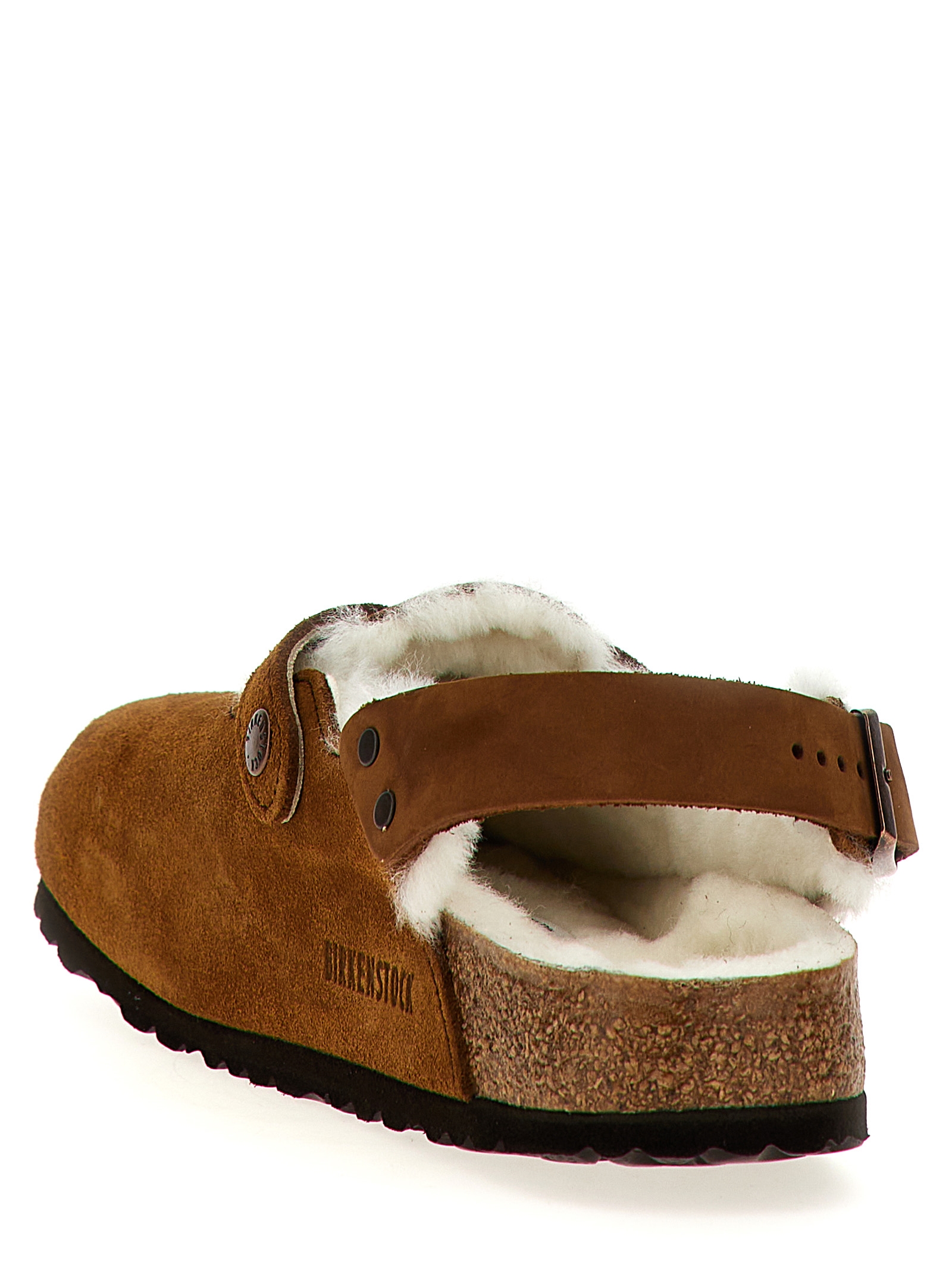‘Tokio’ suede mules with lamb fur lining, straps with adjustable metal pin closures, cork fussbett, EVA sole.