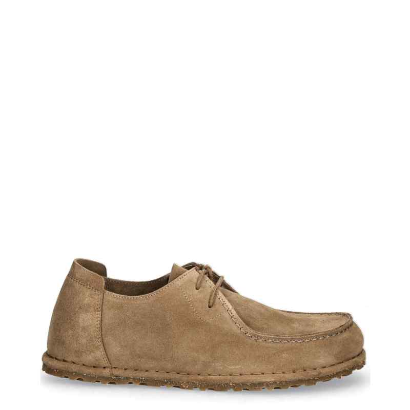 taupe suede front lace-up fastening debossed logo to the side round toe rubber sole Utti sneakers. Size and Fit – Narrow fit