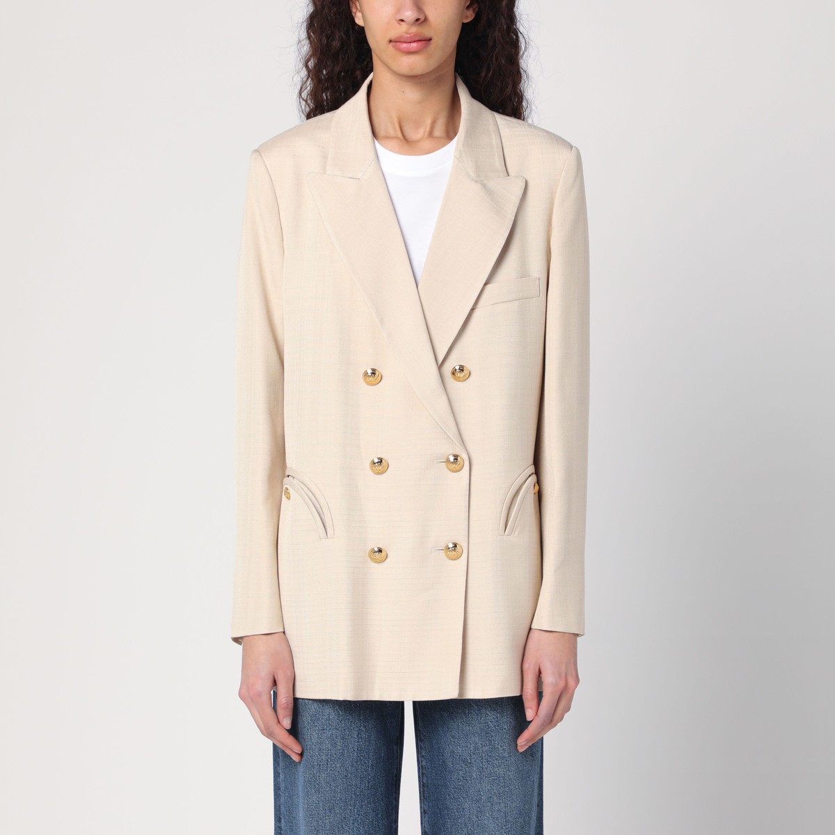 Double-breasted jacket by Blazè Milano in ivory viscose fabric, characterized by a front closure with golden buttons, long sleeves with buttoned cuffs, lance lapels, a welt pocket on the chest, two Smiley buttoned pockets on the front, a double back vent, and slightly padded shoulders.
