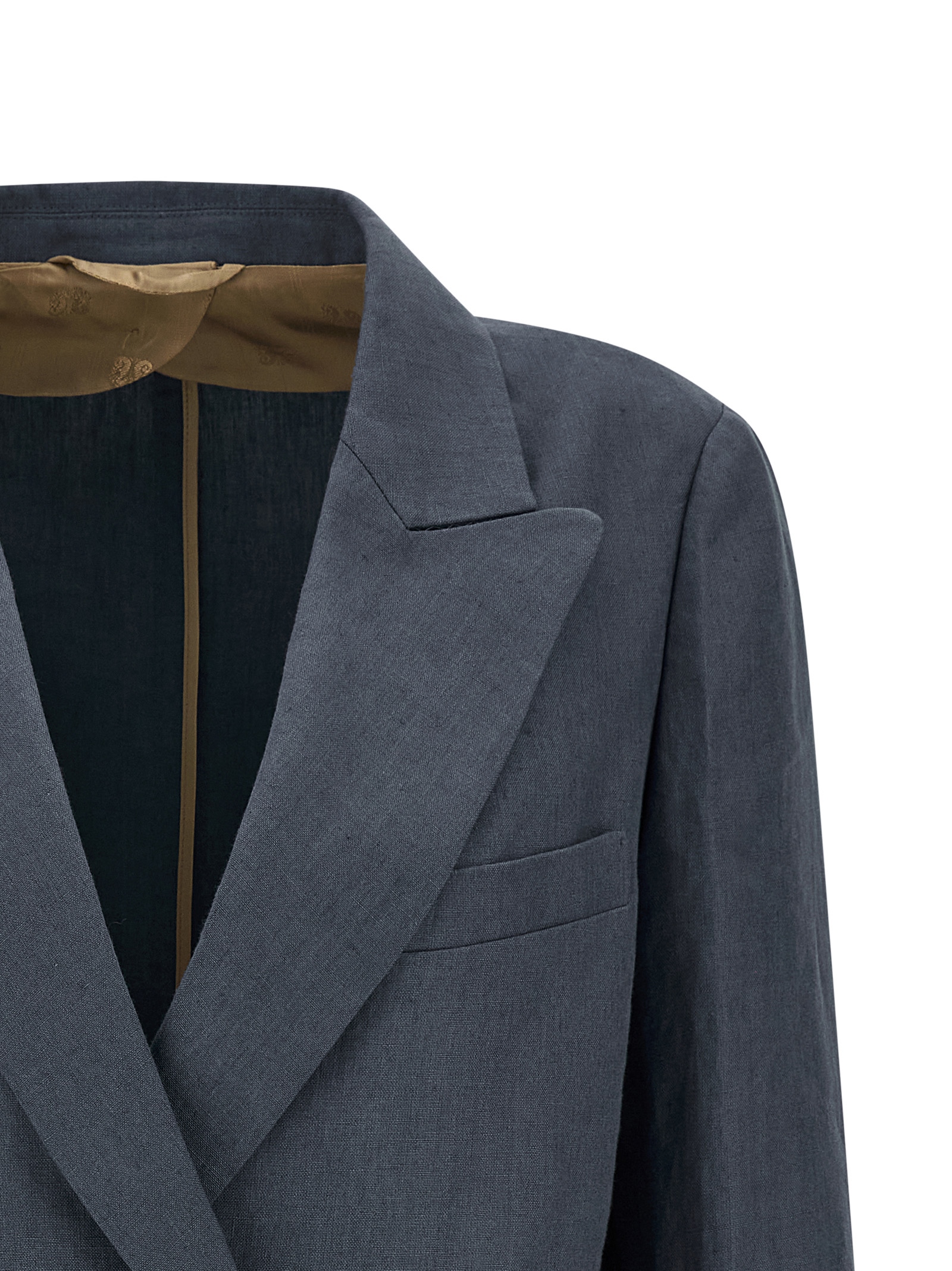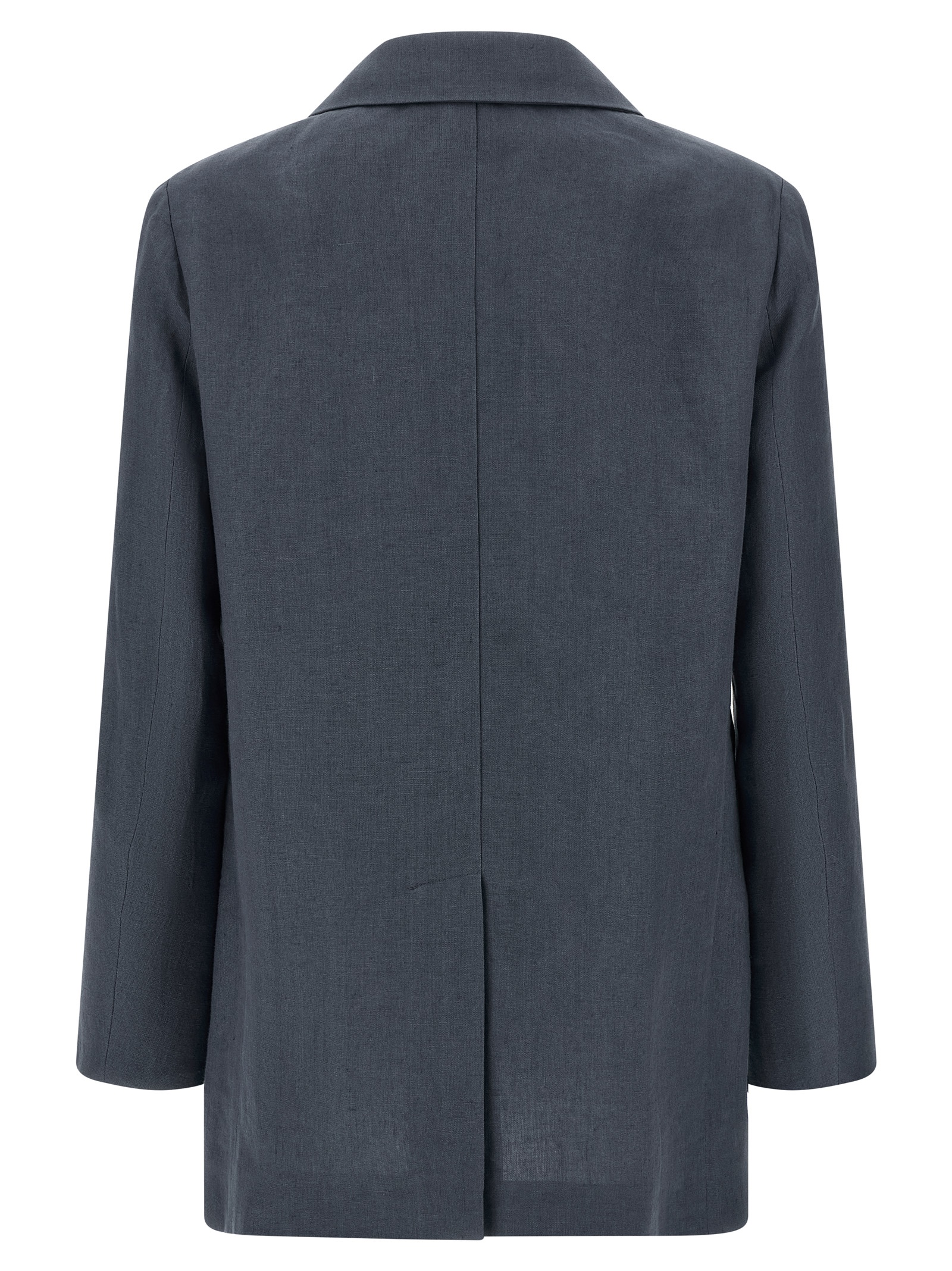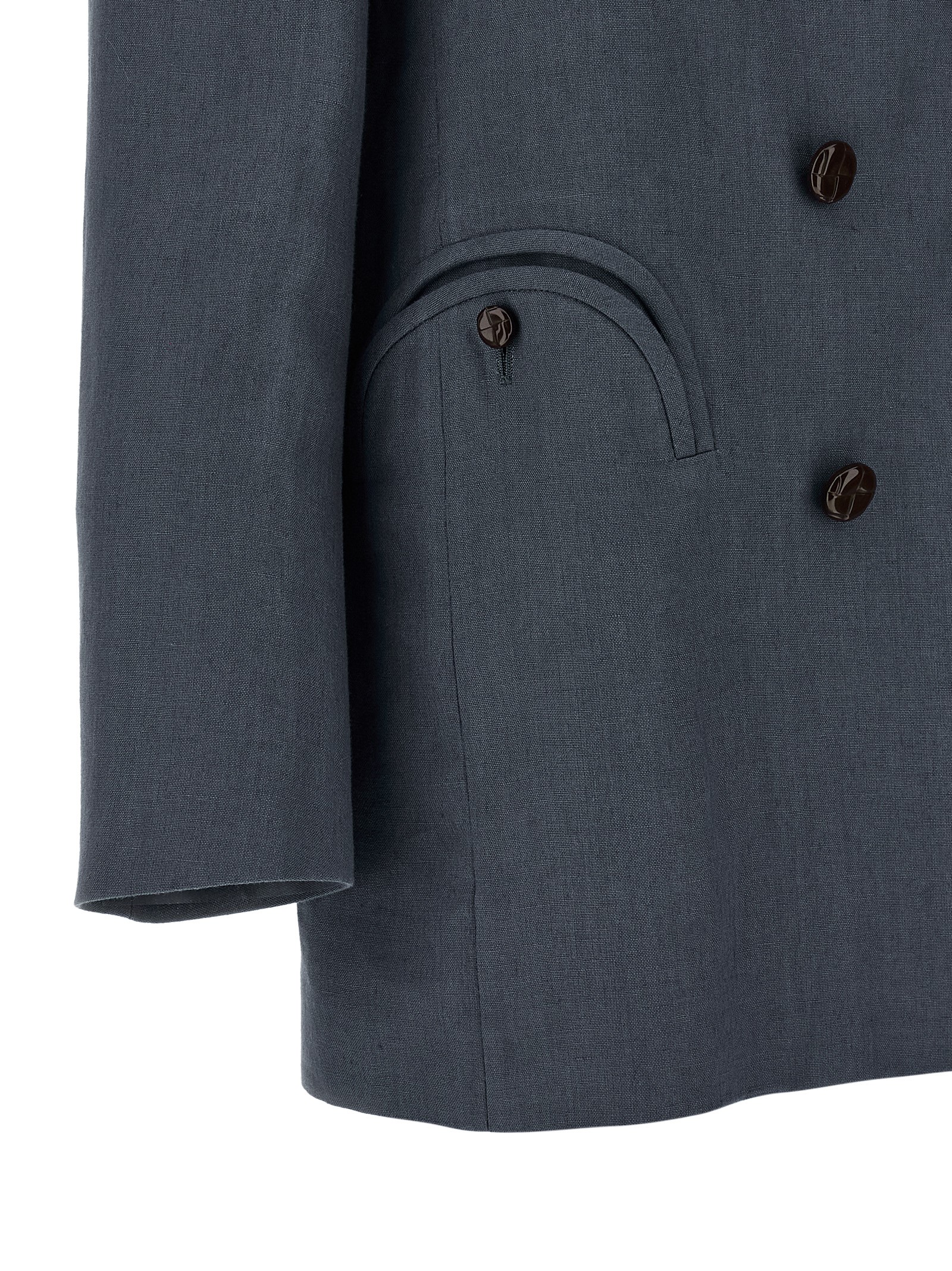 ‘midday sun everyday’ double-breasted linen blazer with peak lapels, Front closure with shiny buttons, Breast pocket, ‘smiley’ pockets, Four inner pockets, Long sleeves, Structured shoulder strap, Back split, Monogram viscose lining.