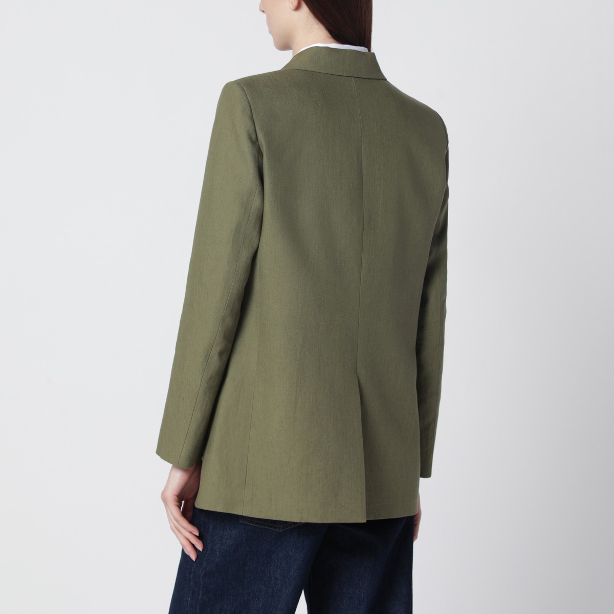 Double-breasted jacket by Blazé Milano in olive green linen, featuring front button fastening, long sleeves with buttoned cuffs, one chest welt pocket, two Smiley pockets with button on the front, back vent and lightly padded shoulders.