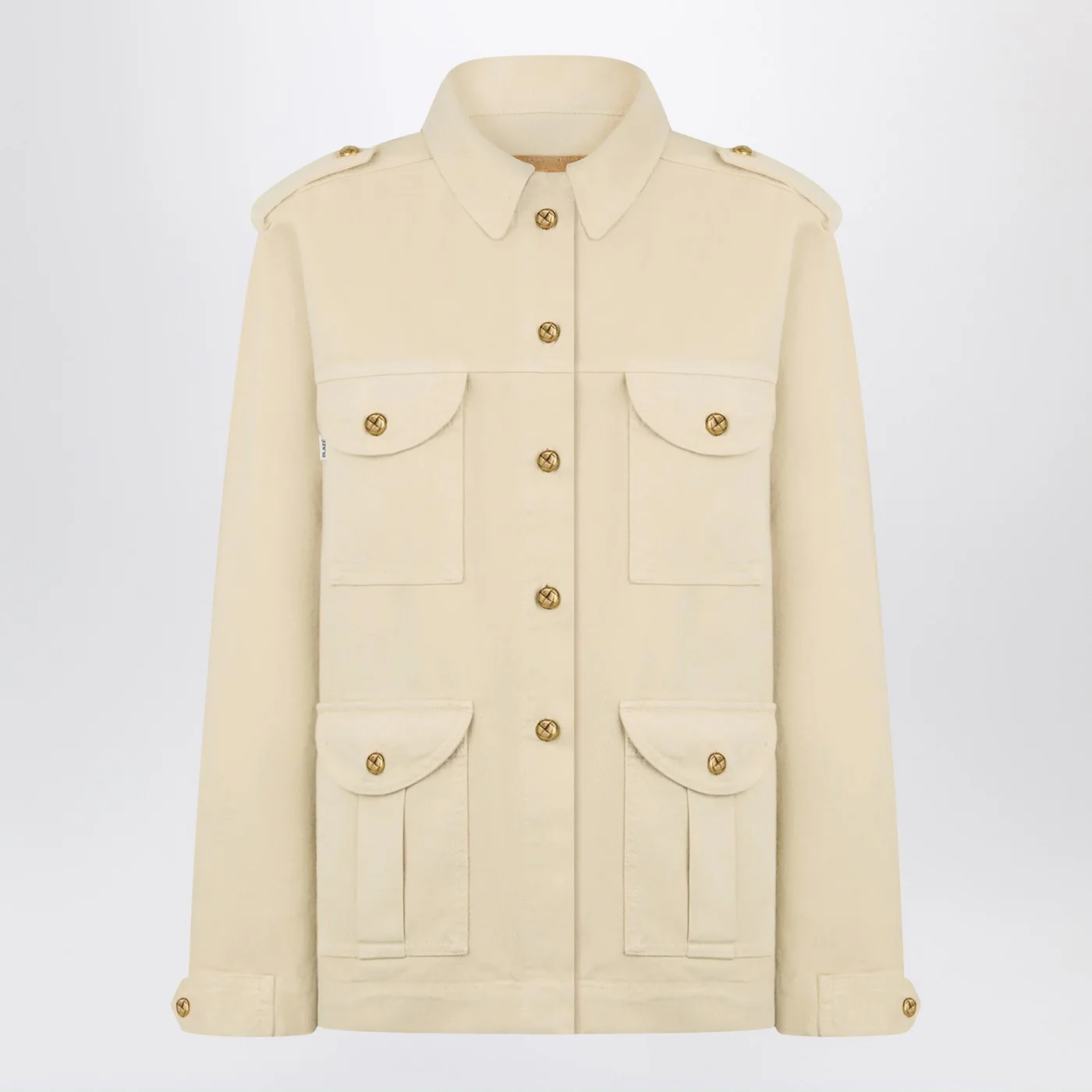 Jacket by Blazé Milano in beige cotton denim, featuring a safari-style design, relaxed fit, collar, front button fastening with gold-finish metal buttons, four Smiley utility pockets and buttoned cuffs.