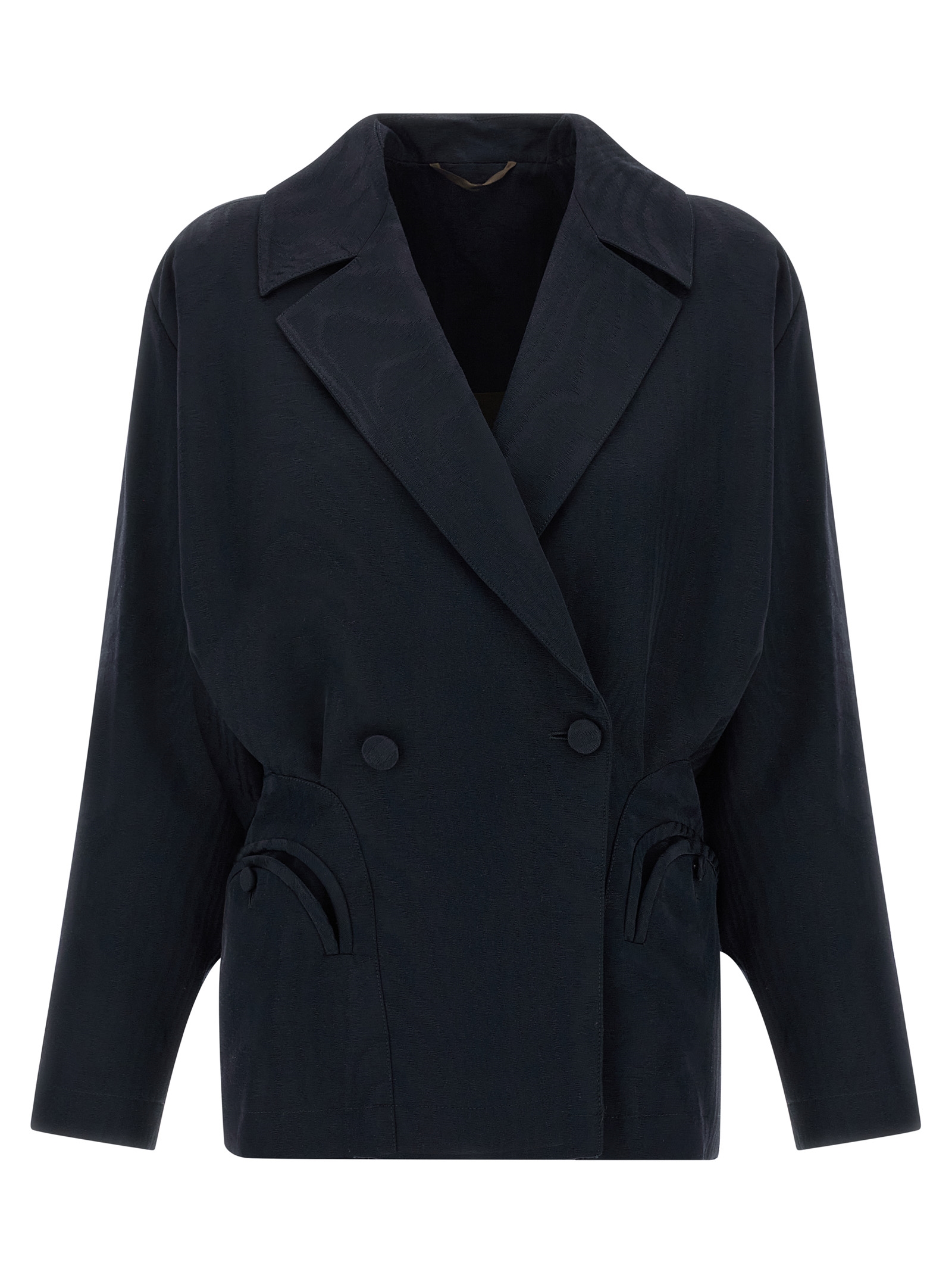 ‘Sharewood Ares’ blazer in cotton blend and moiré viscose, ribbed line with back puff waist, double-breasted style with front covered button closure, ‘Smiley’ pockets, structured shoulders, long sleeves, monogram viscose lining.