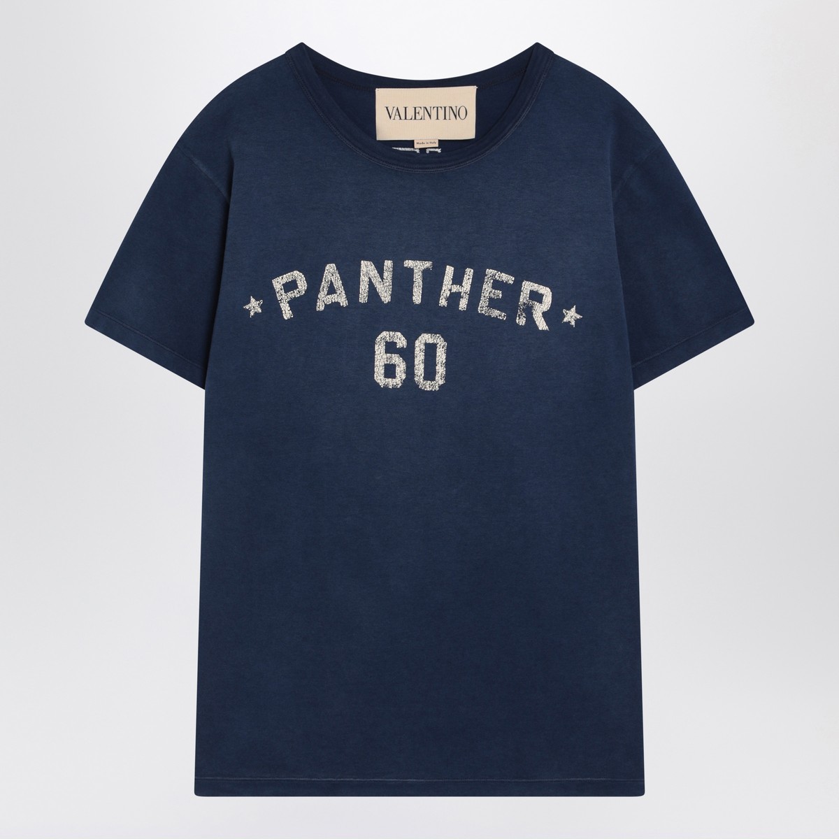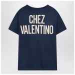Blue vintage effect cotton T-shirt by Valentino, featuring short sleeves, ribbed crew neck, front print, and contrasting Chez Valentino embroidery on the back.