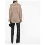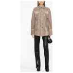 eyelet-detail denim jacket from BLUMARINE featuring light brown, cotton blend, eyelet detailing, pointed flat collar, front button fastening, two chest flap pockets, two side flap pockets, long sleeves and curved hem. Pocketed denim jacket