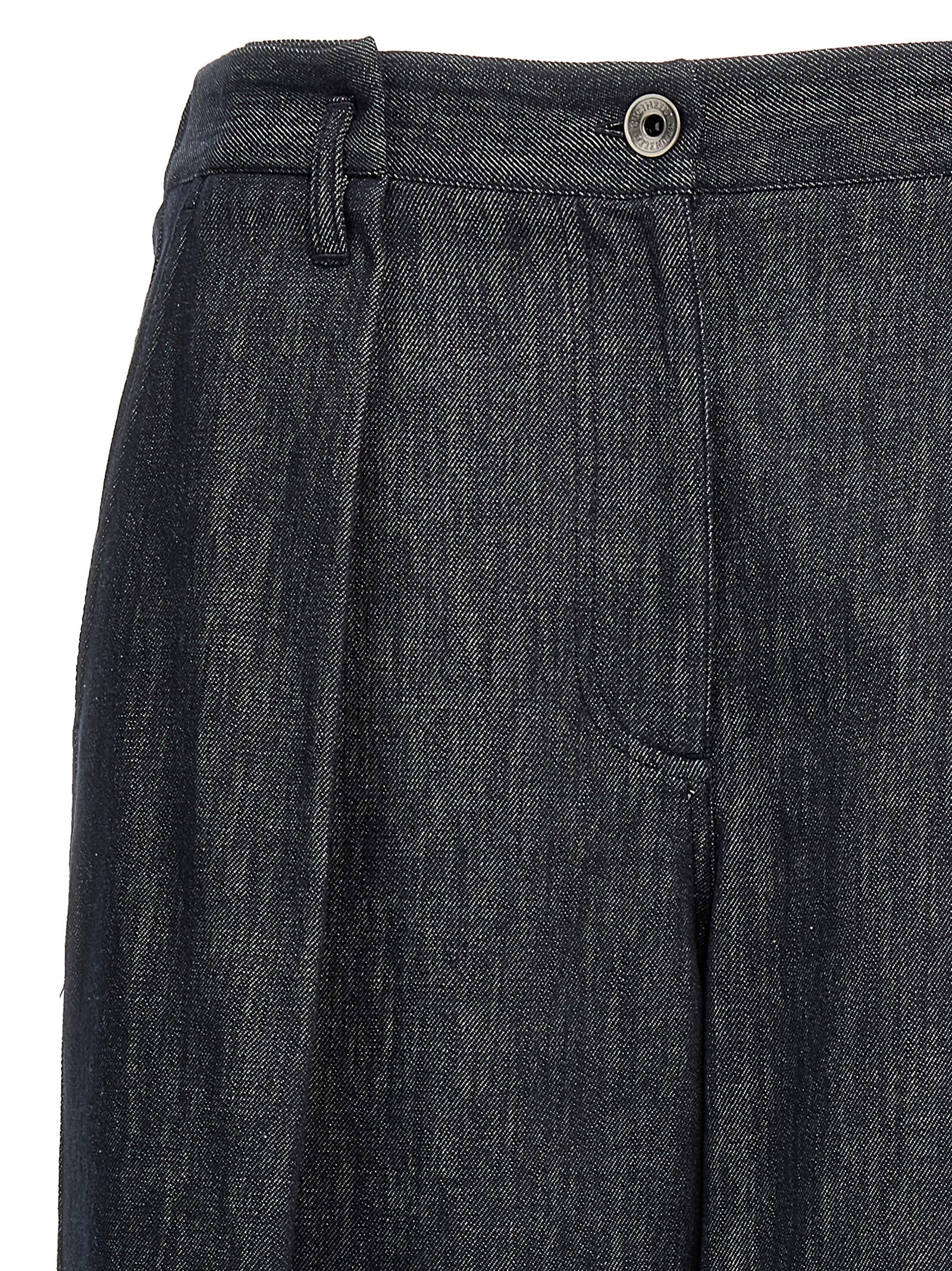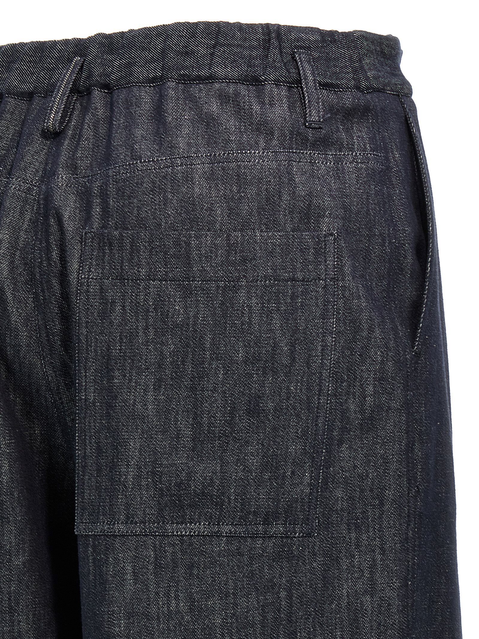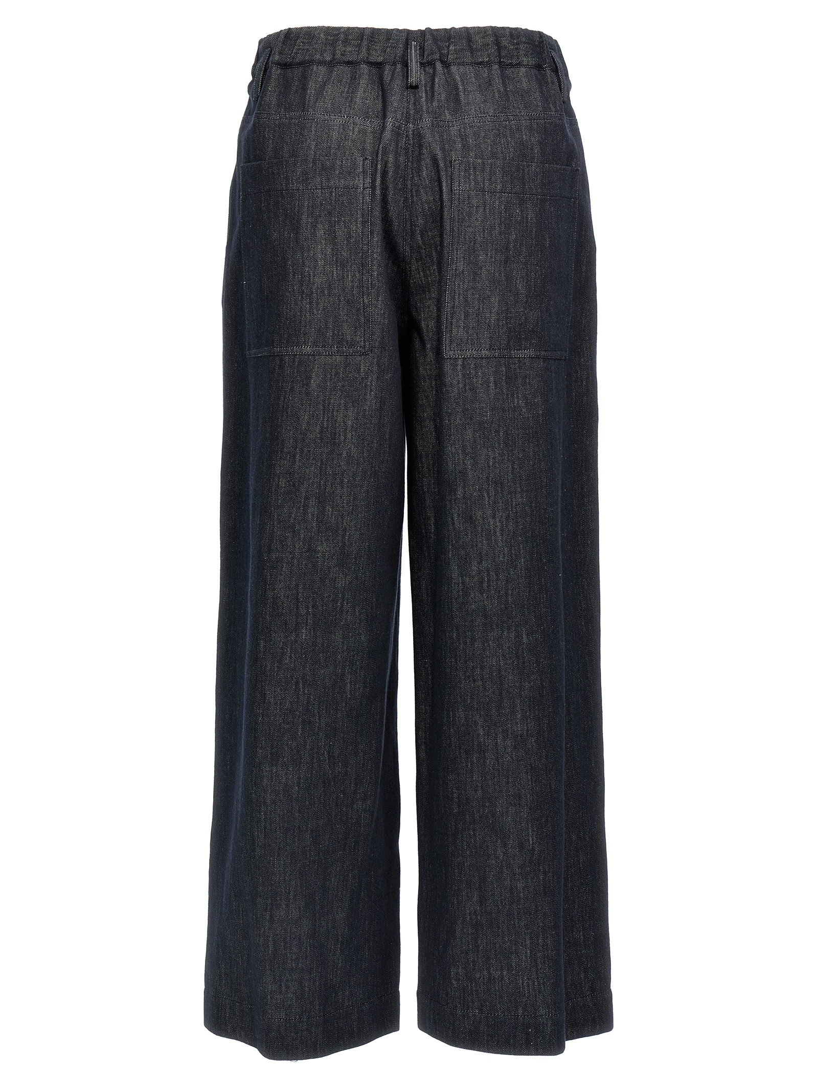 ‘a-line pleated’ denim-effect twill pants with front pleats and back monile detail, Elastic waistband, Palace leg, Zip and button closure, Pockets.