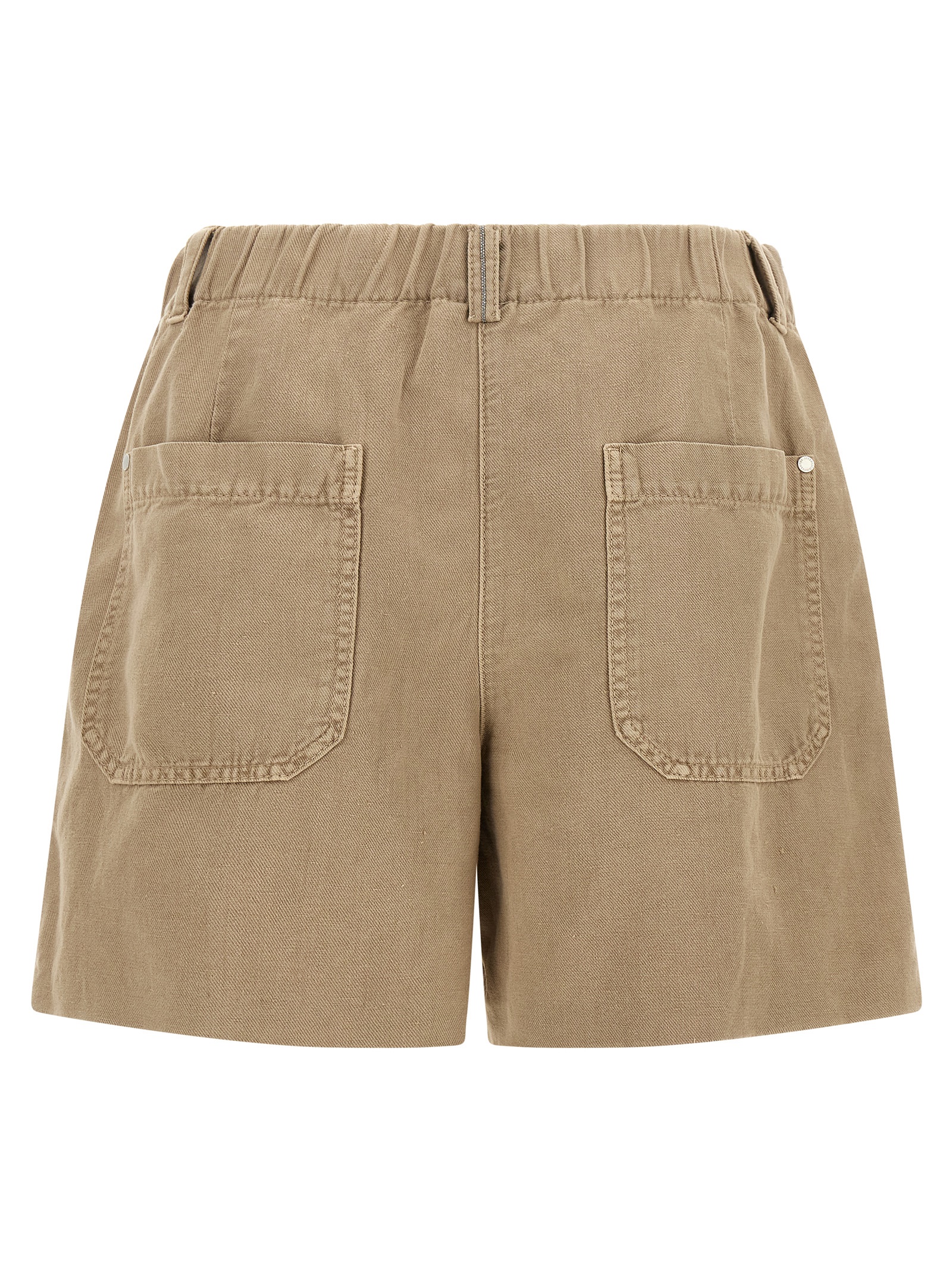 ‘baggy’ shorts in garment-dyed cotton and linen cover, Double front pincer, Monile detail and elastic waistband at the back, Zip hook and front button closure, Front american pockets, Back welt pockets.
