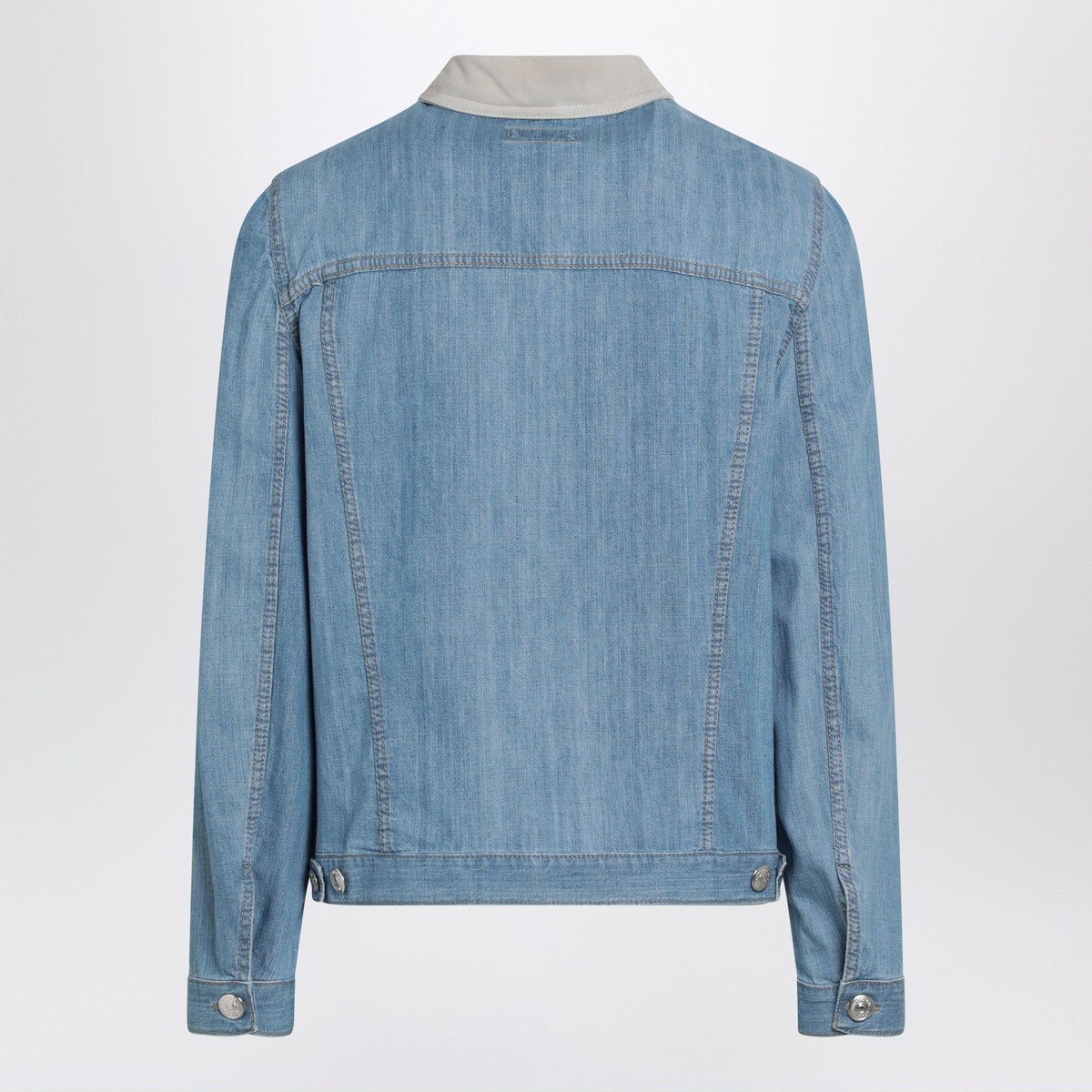 Light blue cotton denim jacket by Brunello Cucinelli featuring a front button fastening, long sleeves with buttoned cuffs, adjustable hem, contrasting suede collar, two front pockets and contrast stitching.