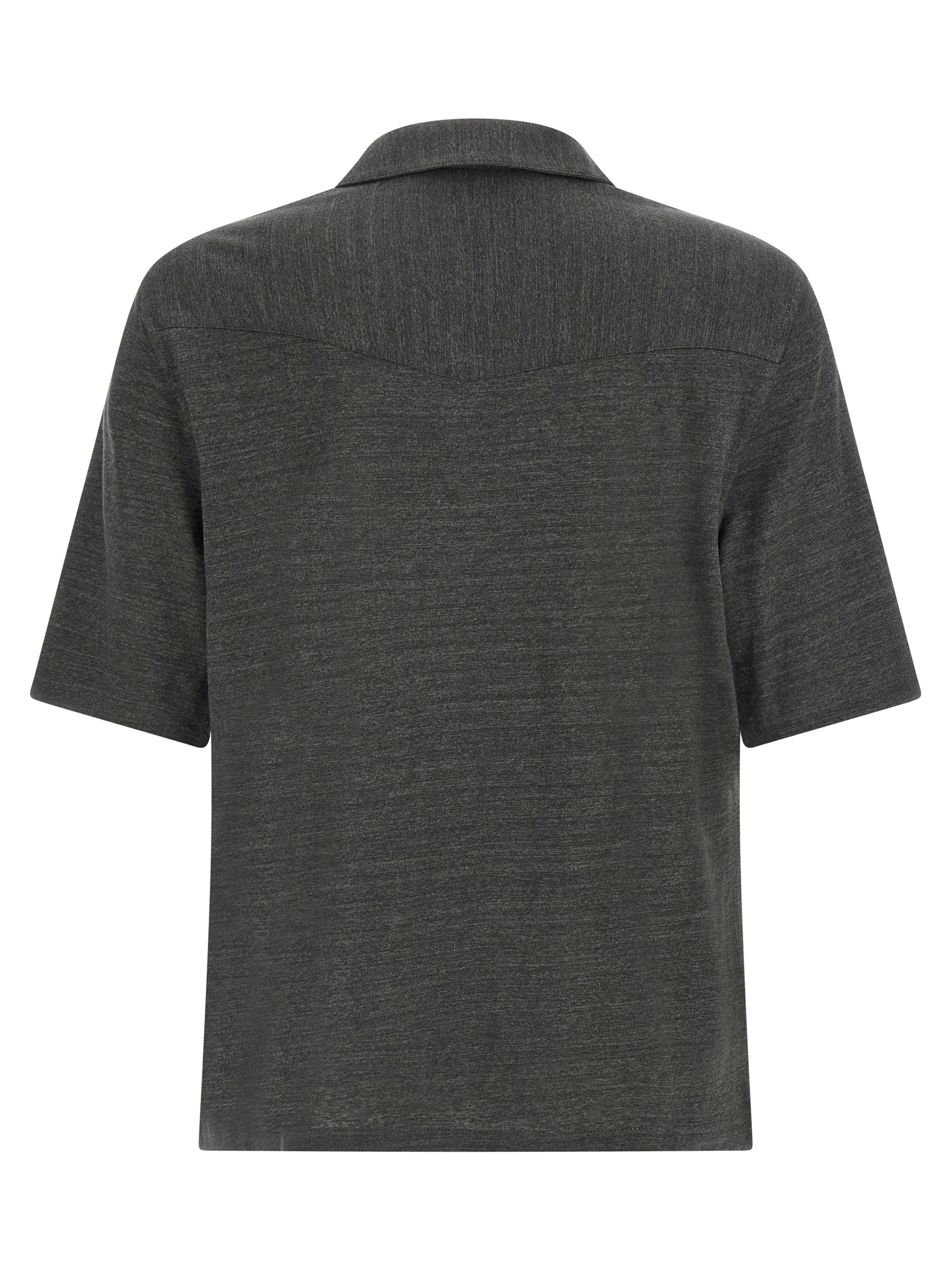 Linen and cotton mélange jersey shirt, Straight silhouette, Wide ‘camp’ collar, Front mother-of-pearl button closure, Short sleeves. Size and Fit – true to size fit