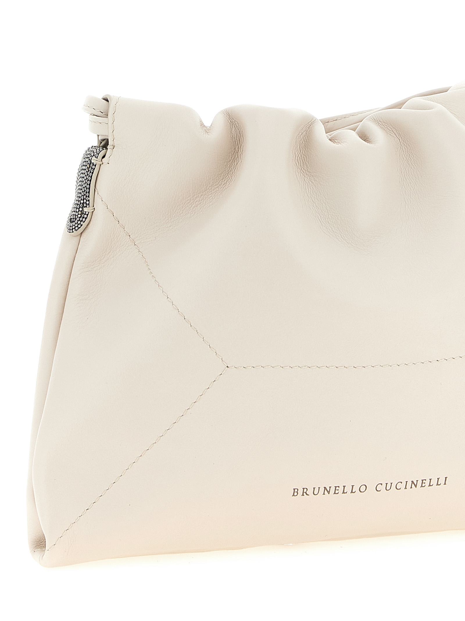 Nappa shoulder bag, Geometric stitching pattern, Embossed metallic front logo, ‘monile’ detail in the side loop, ‘coulisse’ closure that also works as a shoulder strap with double leather lace and shoulder reinforcement, Inner paper pocket.