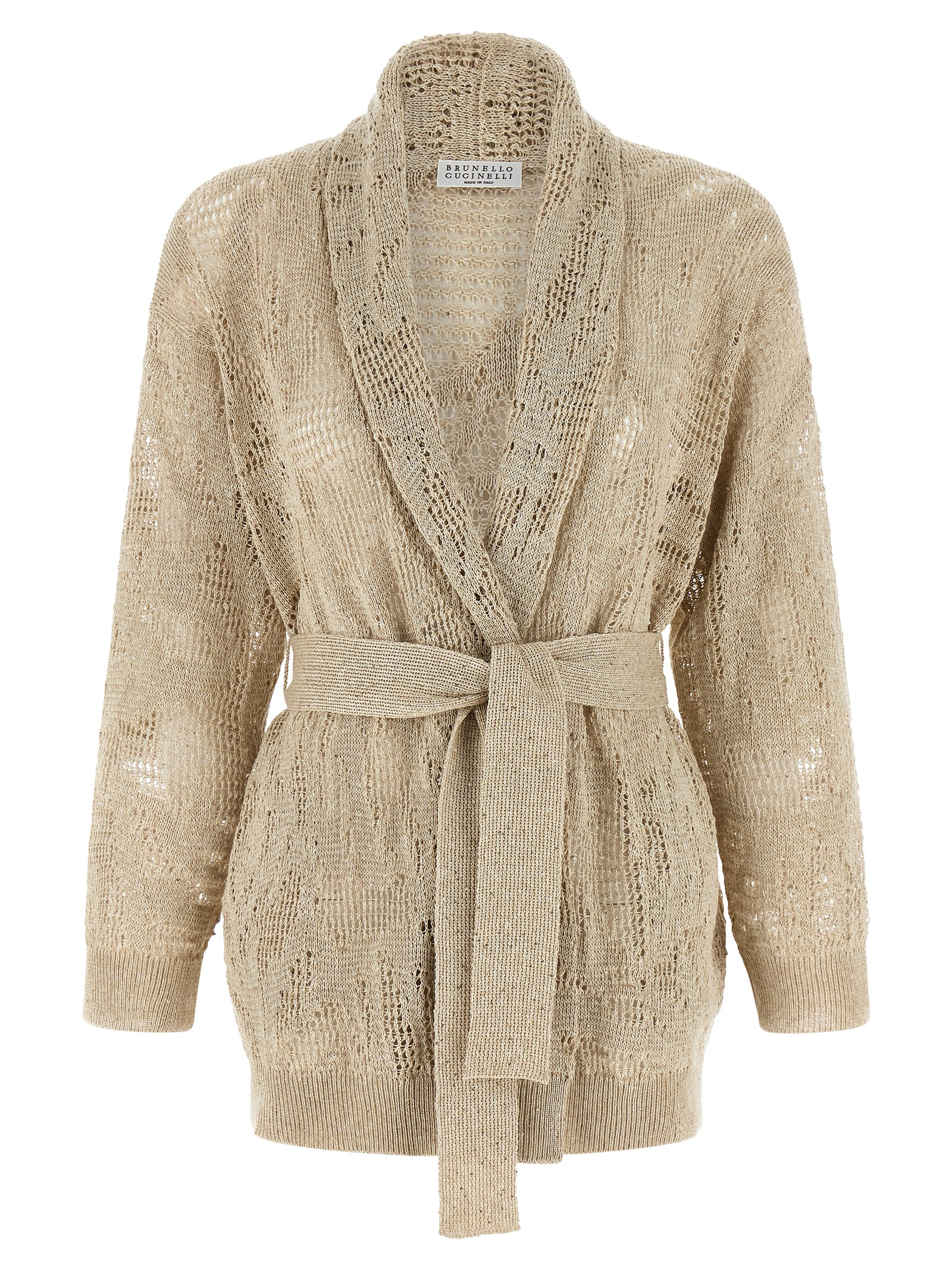 Cardigan in linen and cotton blend crocheted with micro sequin application, Robe style, Shawl collar, Pockets, Long sleeves with cuffs and dropped shoulder, Removable belt.