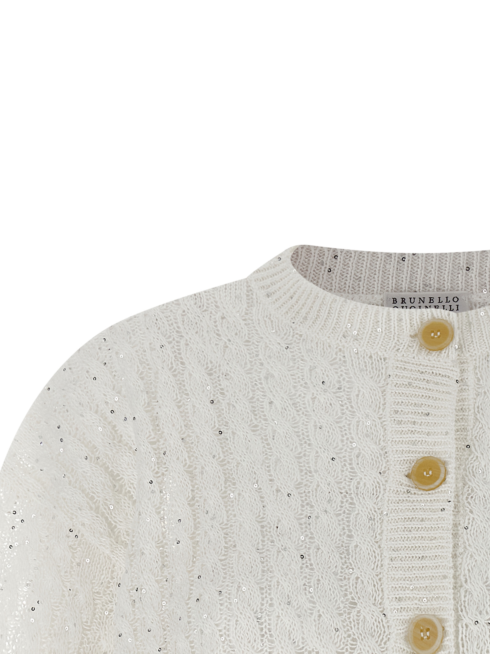 ‘Dazzling Cable’ openwork ribbed linen cardigan with braided pattern and all-over sequin application, crop model, crew neck, short sleeves with cuffs and dropped shoulder.