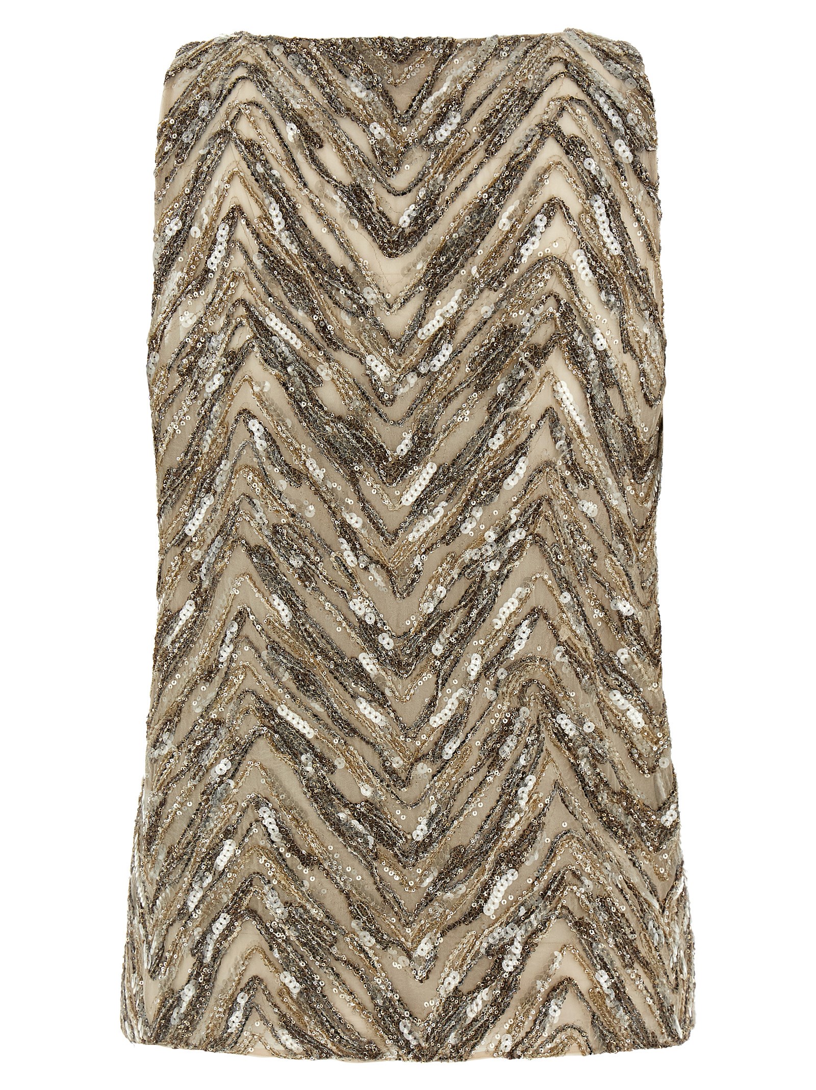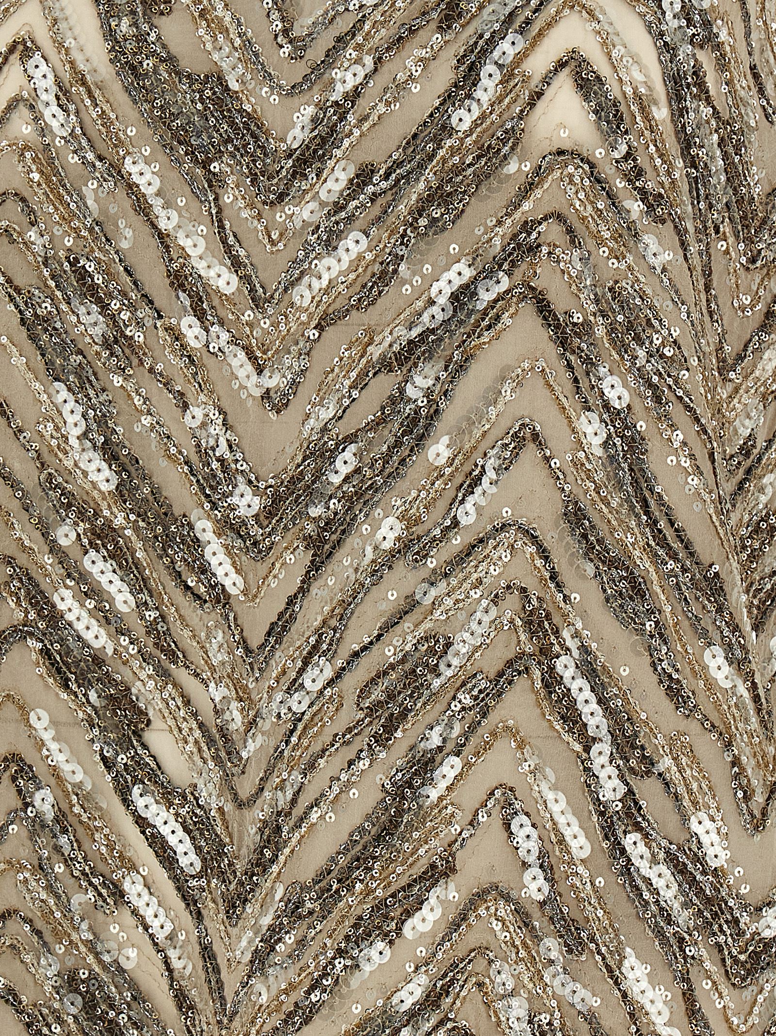 Crispy silk top with sequin and lamé thread embroidered ‘dazzling chevron embroidery’ and wide front v-neck.