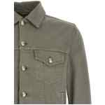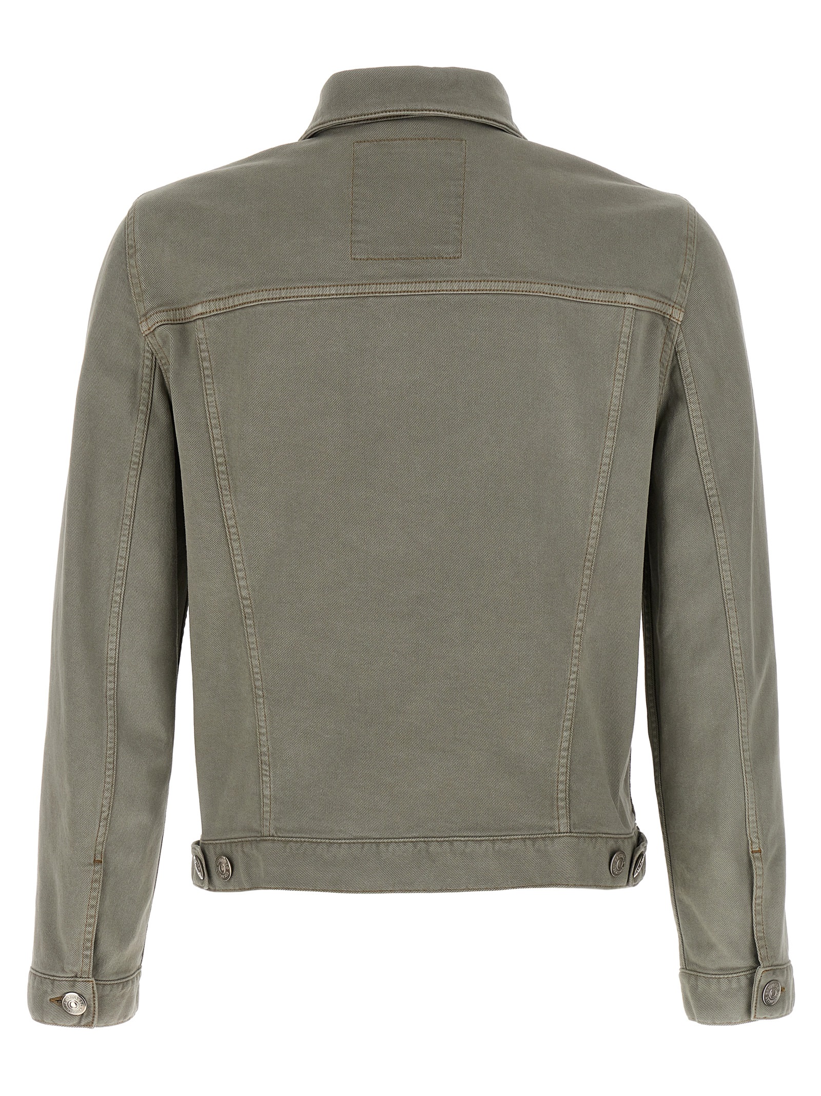 Lightweight cotton denim jacket with a comfortable, Garment-dyed finish and a subtle gradient effect, Featuring contrast stitching, A shirt collar, A front metal button closure, Pockets, Long sleeves with cuffs, And no lining.