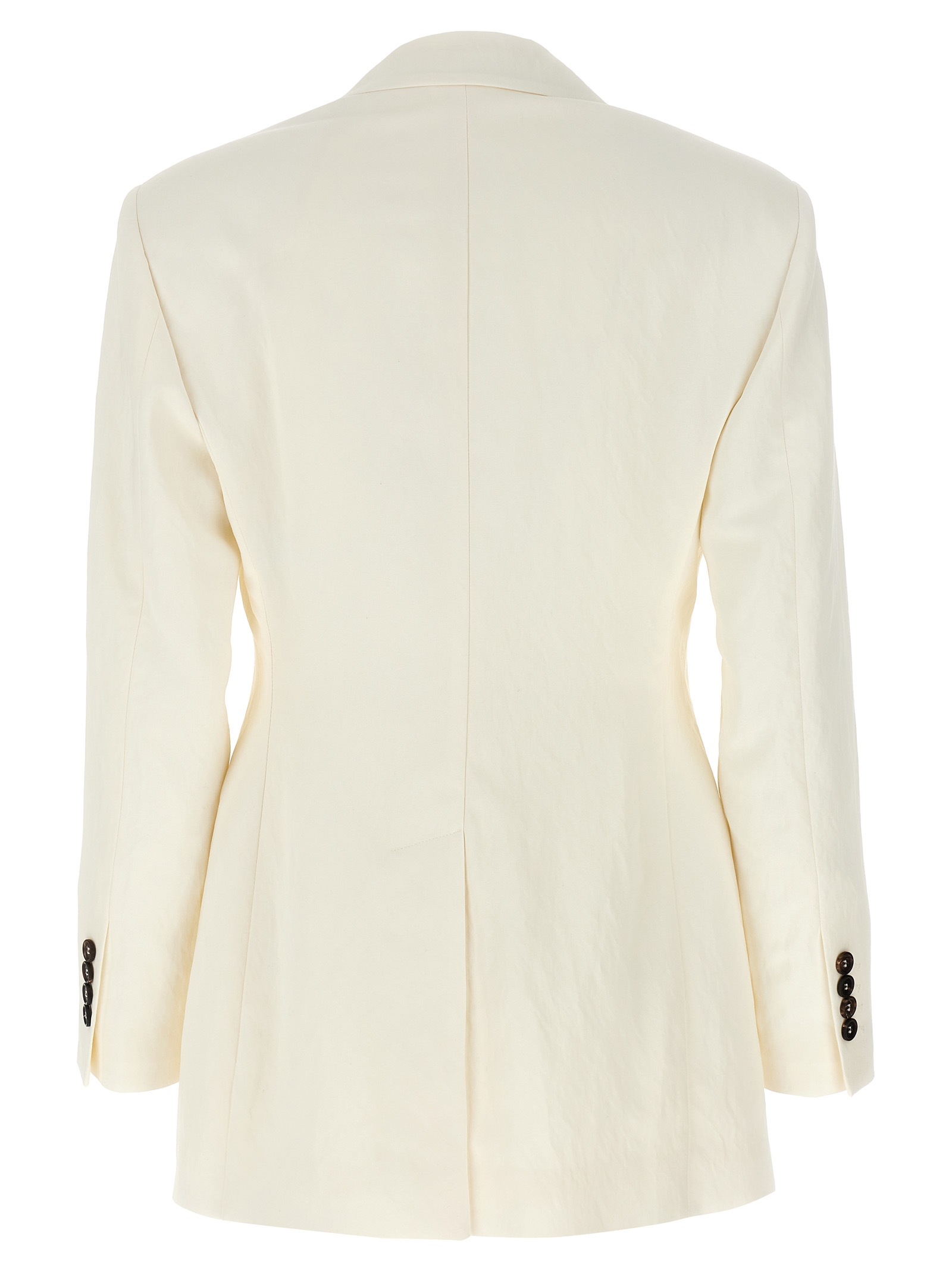Double-breasted viscose blend blazer with button closure, peak lapels, pockets, long sleeves, lining, padded shoulders, and back split.