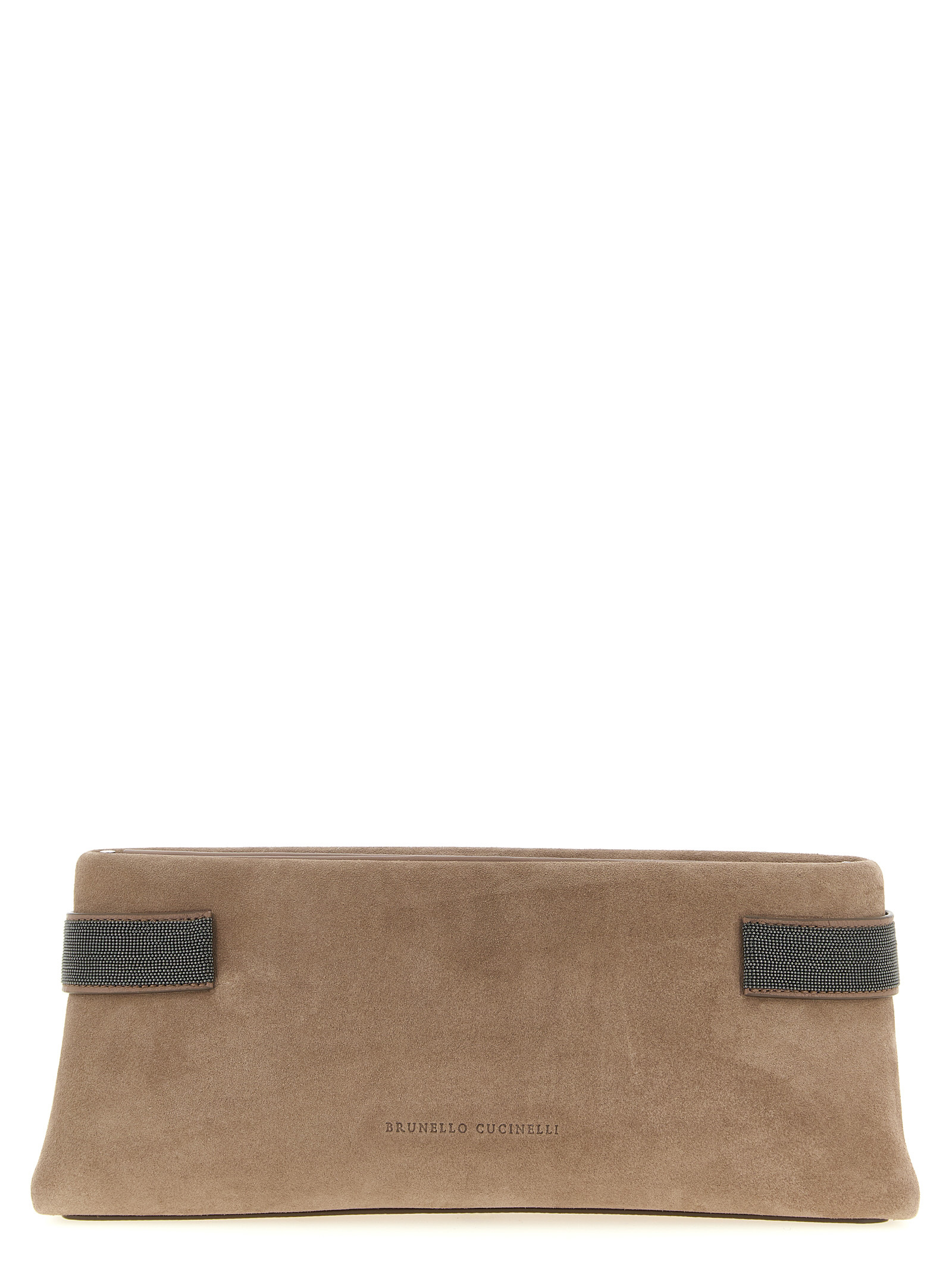 Suede Essence pouch with Monile Precious Bands side inserts, magnetic closure and leather lining.
