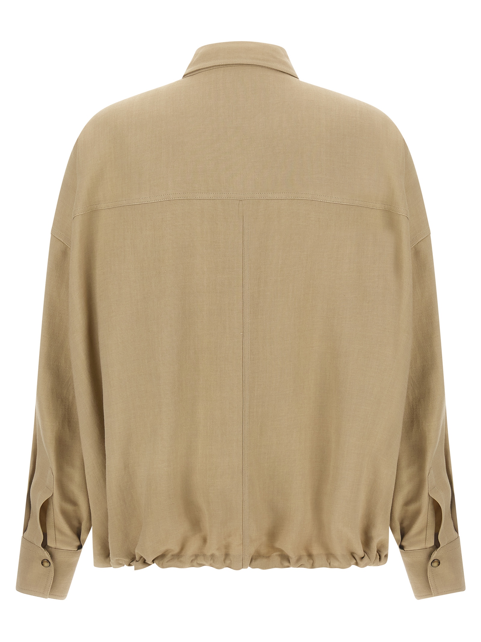 Fluid viscose and linen twill shirt, Pointed collar, Pockets, Front snap button closure, Long sleeves with cuffs and dropped shoulder, Drawstring on the hem. Size and Fit – Comfort fit