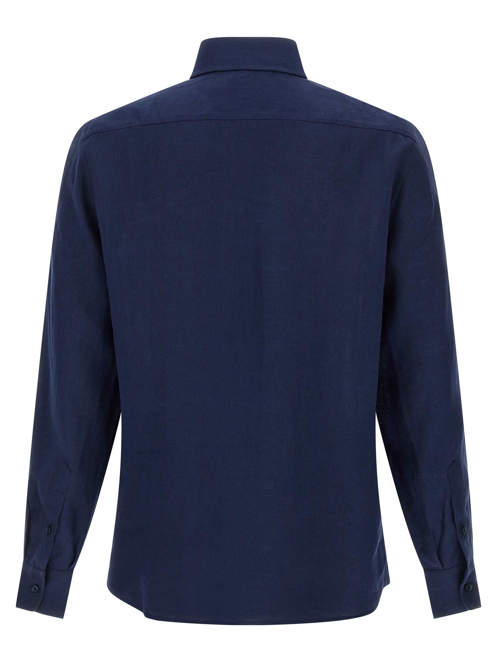 Linen shirt with french collar, Front button closure, Long cuffed sleeves.