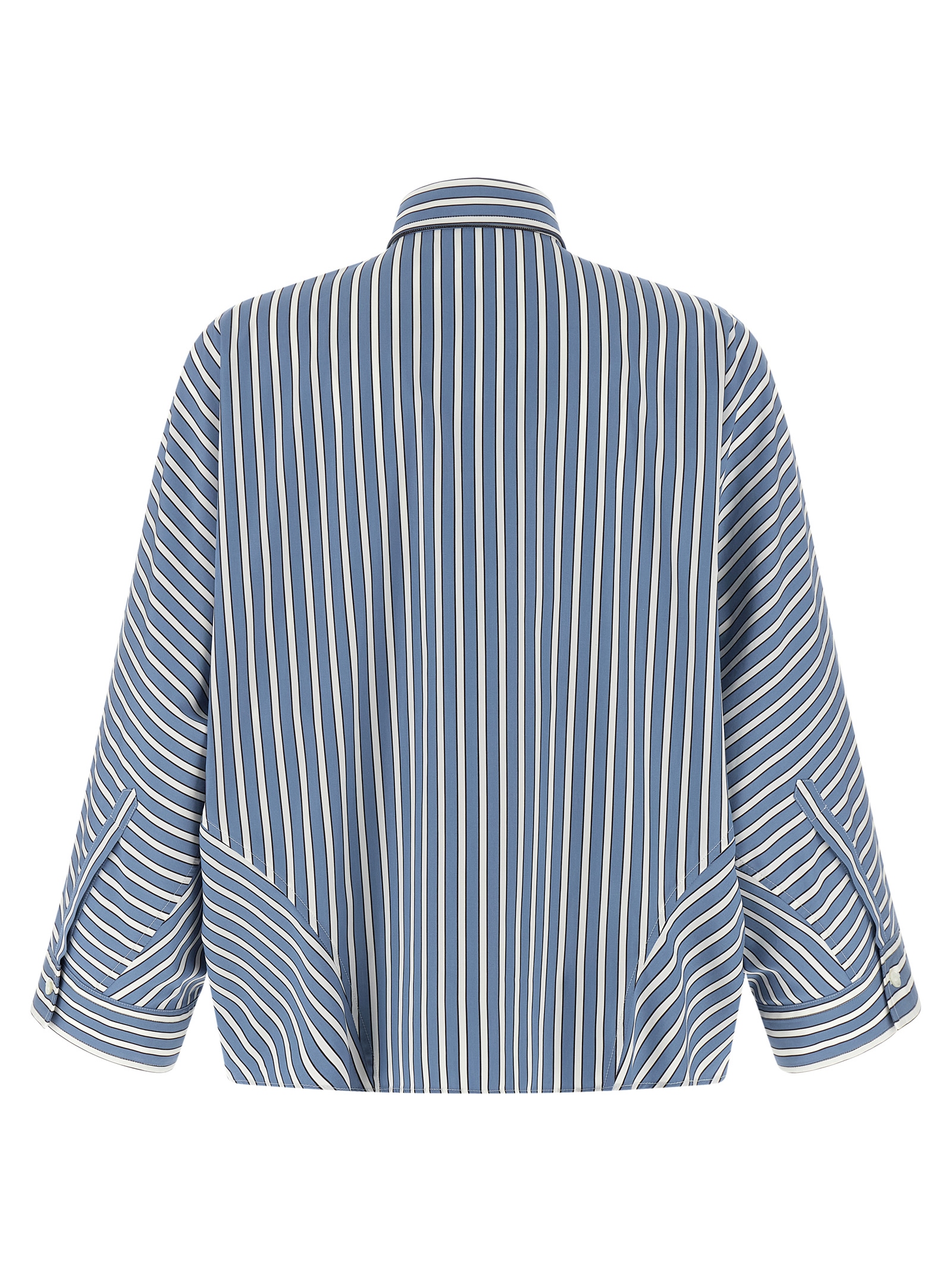 Striped cotton poplin shirt, slightly cropped model, pointed collar with Monile detail on the back, front button closure, 3/4 bat sleeves with cuffs.