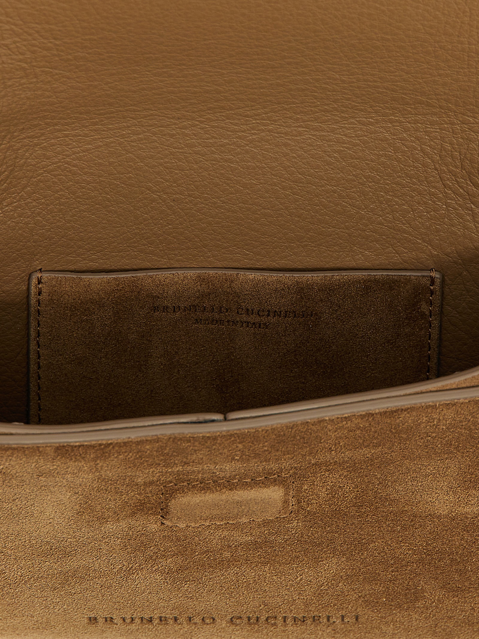 Suede clutch bag, front embossed logo, magnetic flap closure, removable Monile shoulder strap.