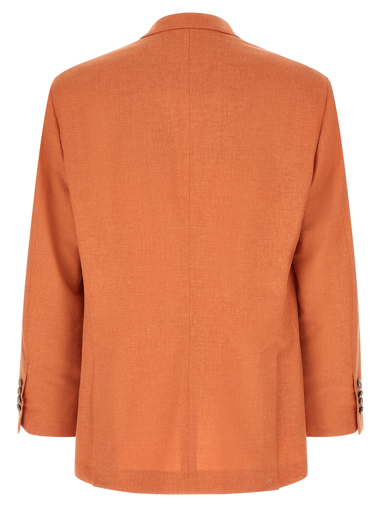 Single-breasted deconstructed single-breasted mouliné canvas blazer in wide-weave virgin wool, cotton and silk, two-way metal button closure, large peak lapels, flap pockets, ticket pocket and chest pocket, two inside pockets with button closure and pen pocket, ‘Spalla Solomeo’, cuffs with four metal buttons and opening buttonholes, Half cupro lining, double rear split.