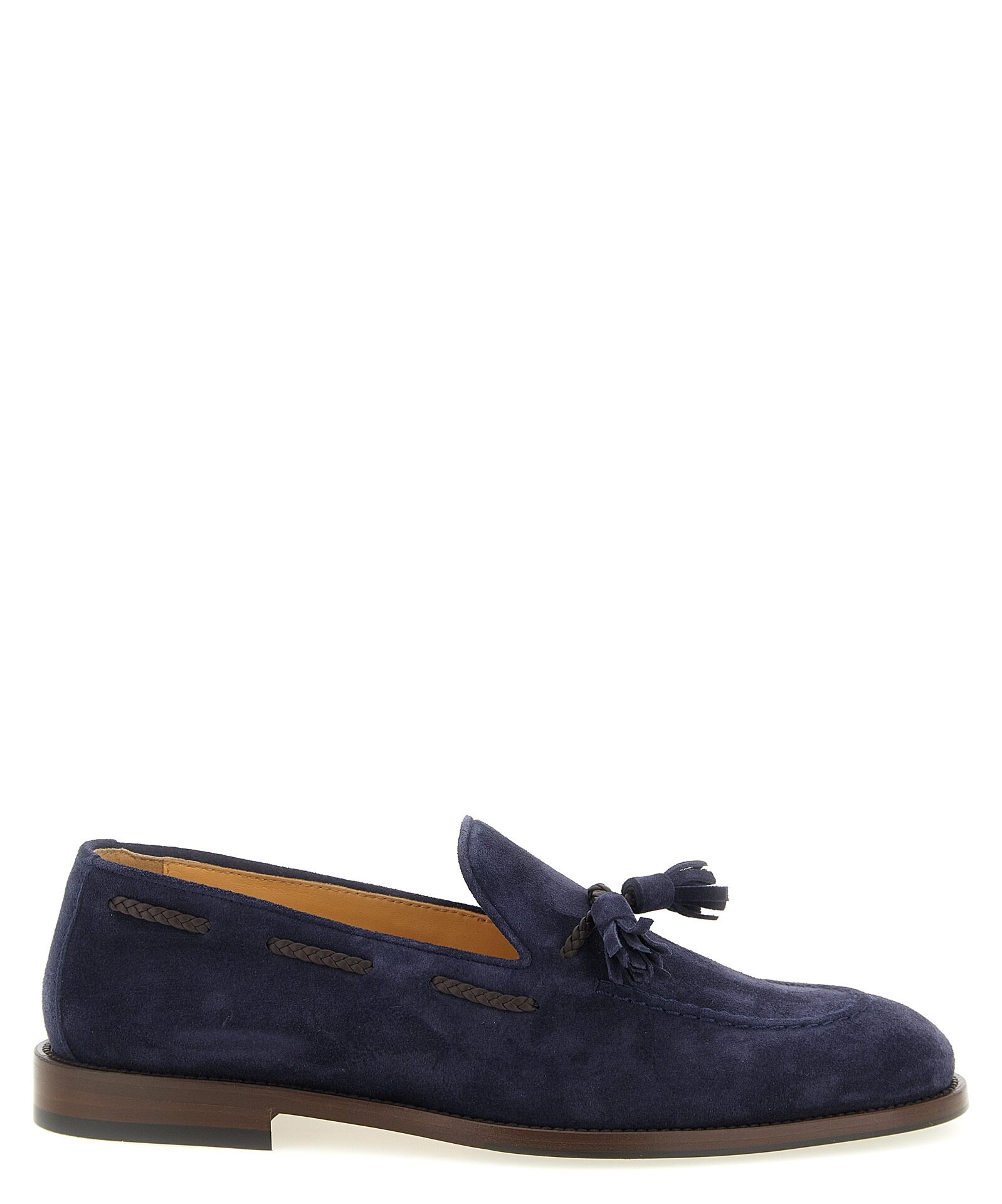 Suede loafers, contrasting woven leather detail with tone-on-tone suede tassels, tapered construction, leather sole with rubber heel and non-slip island under the toe.