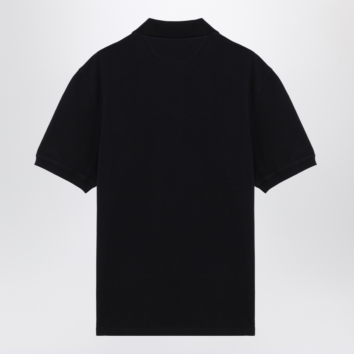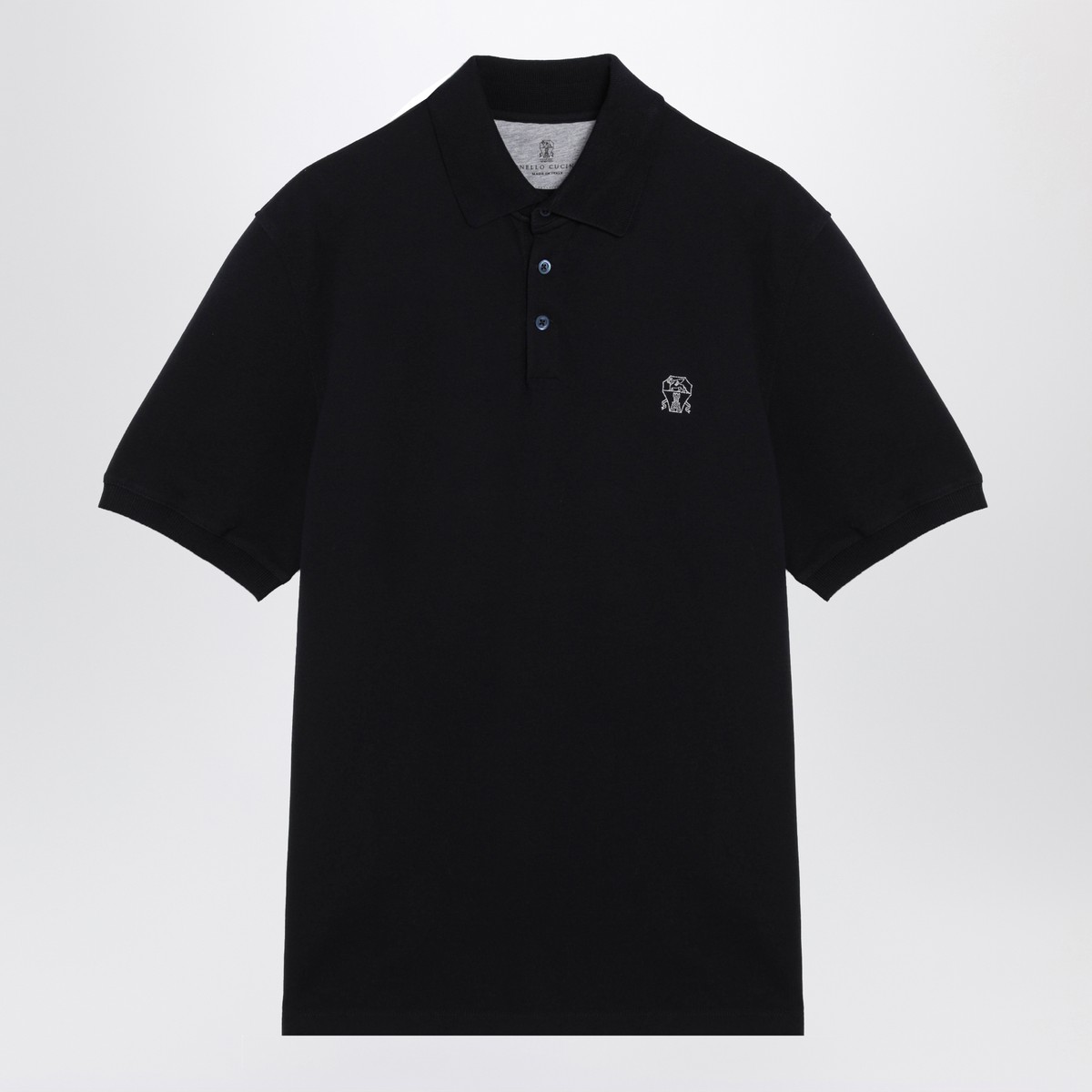 Brunello Cucinelli navy blue cotton polo shirt, featuring short sleeves, front button placket, side slits, and embroidered logo on the chest.