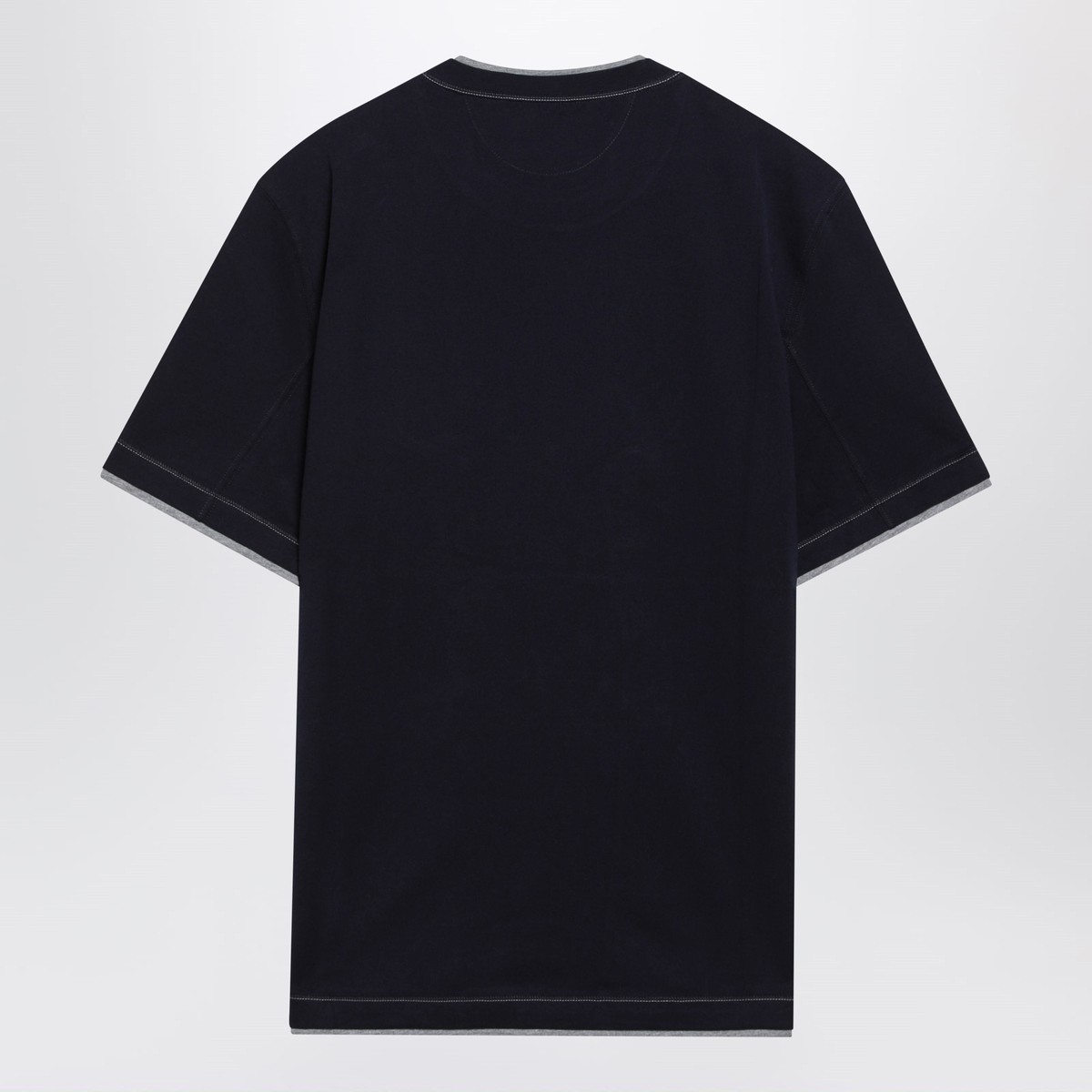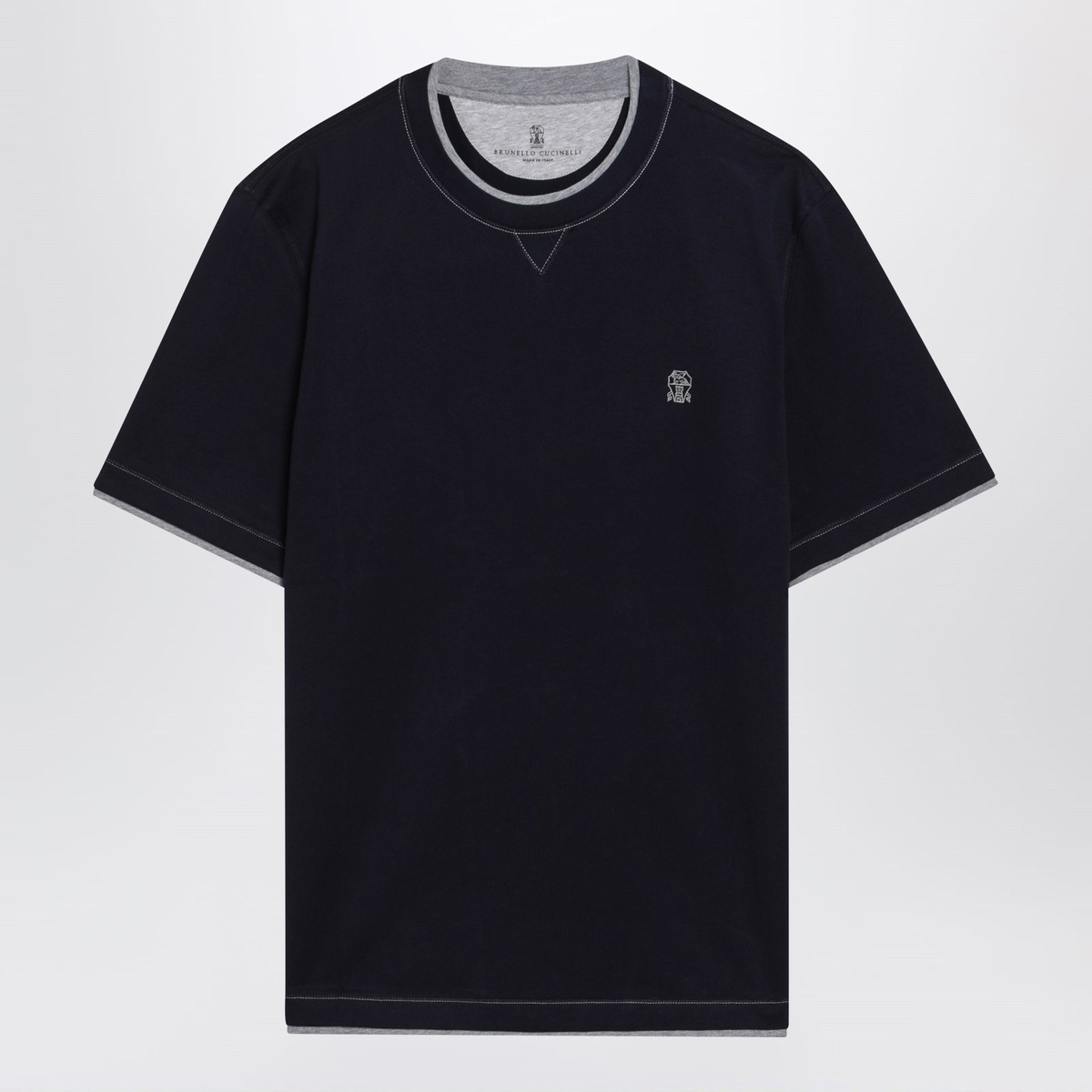 Navy blue cotton jersey T-shirt by Brunello Cucinelli featuring a ribbed crew neck, grey contrast faux-layer insert, short sleeves and embroidered logo on the chest.