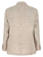 Blazer in flamed pinstriped linen twill, Deconstructed one-and-a-half model with front metal button closure, Peak lapels, Flap pockets, Ticket pocket and chest pocket, ‘spalla solomeo’, Cuffs with opening buttonholes, Back slits, Half cupro lining, Two inside pockets with button closure and pen pocket. Size and Fit – true to size fit – DROP 7