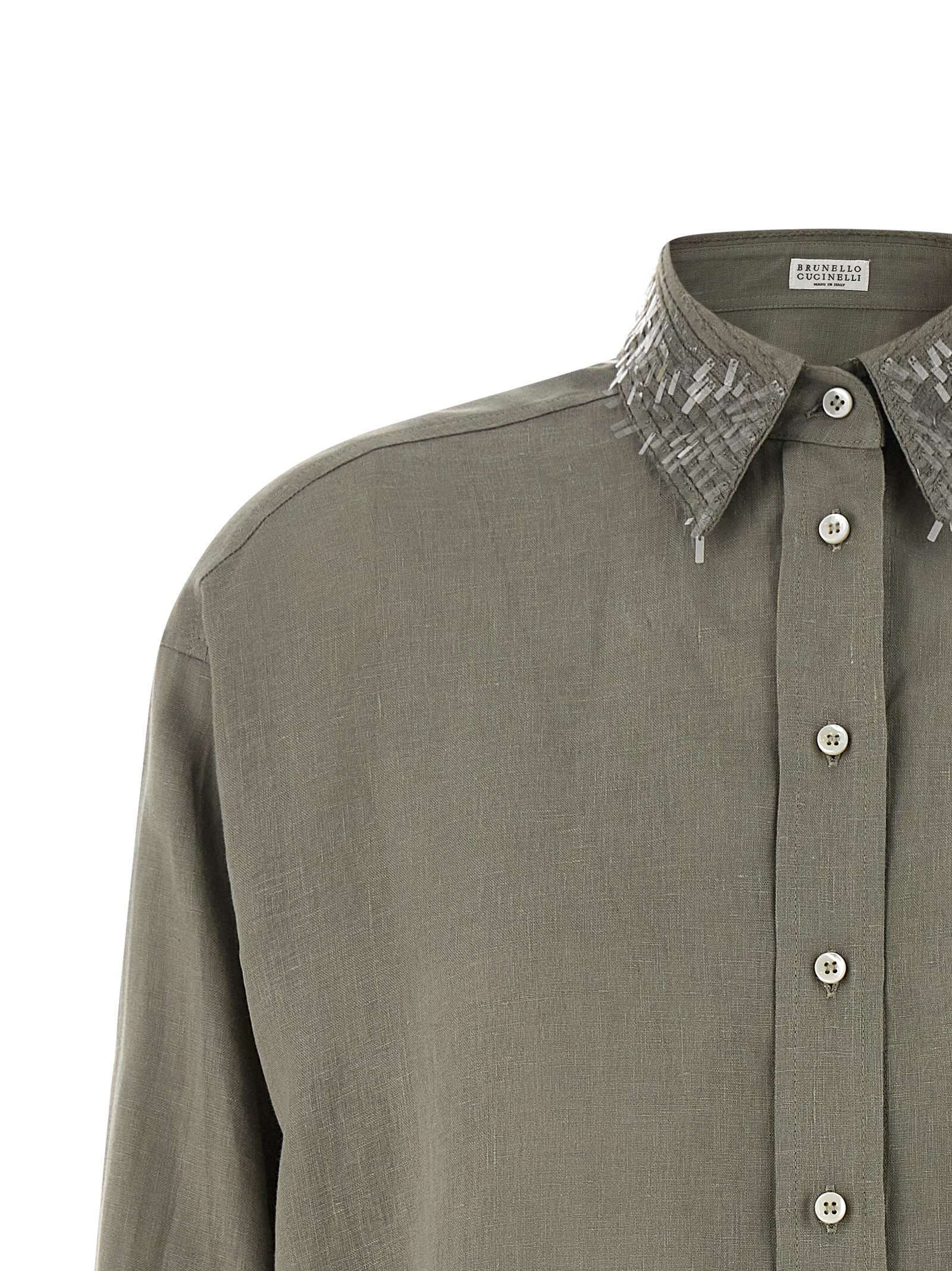 Linen shirt, Pointed collar with embroidered tone-on-tone sequins, Slightly cropped style, Front mother-of-pearl button closure, Long sleeves with cuffs and dropped shoulders, Back loat with cannon pleats, Rounded hem.