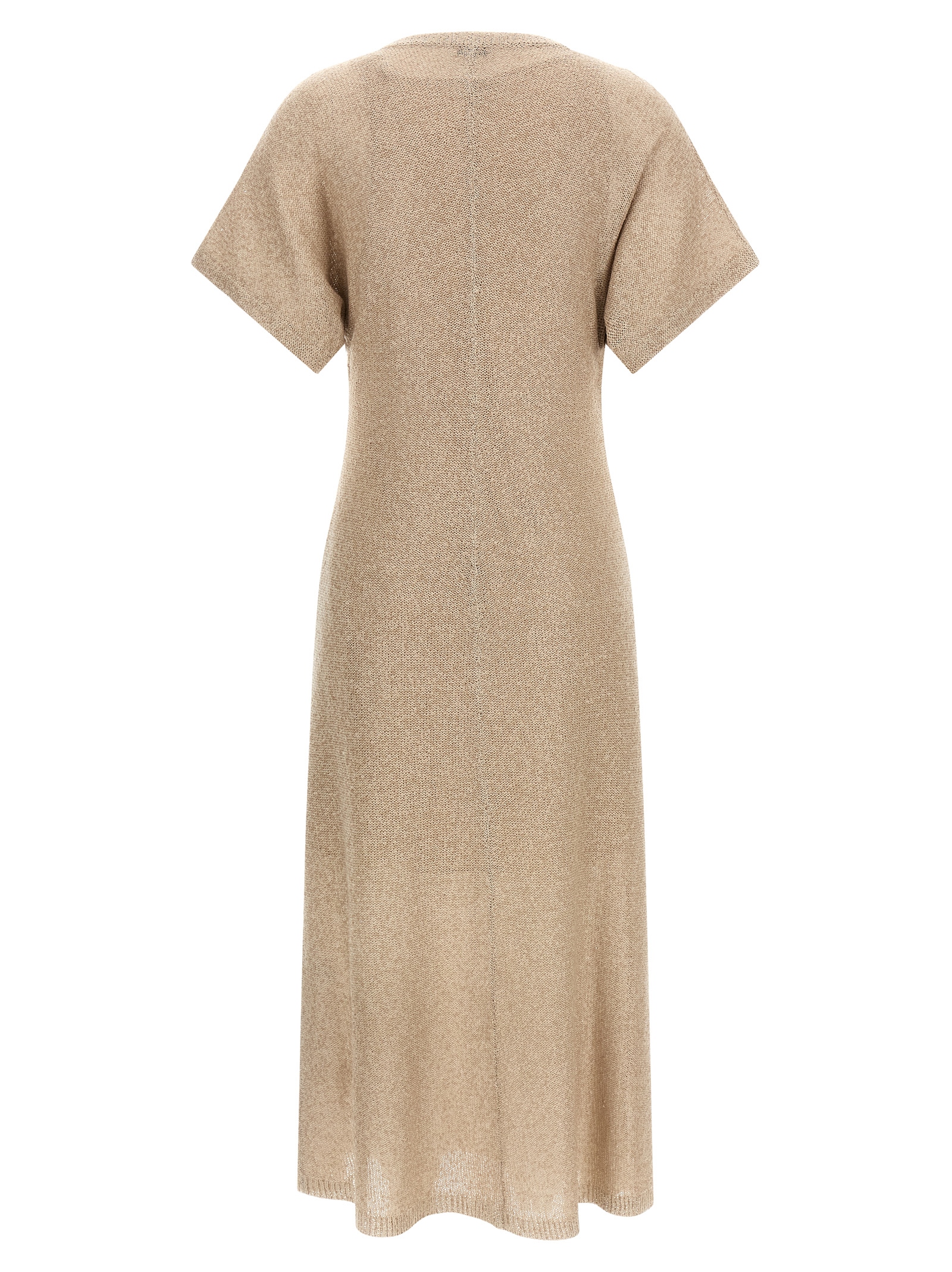 Long dress in linen, cashmere and silk blend with all-over sequin appliqué, round neckline, short sleeves, flared skirt, and removable petticoat.
