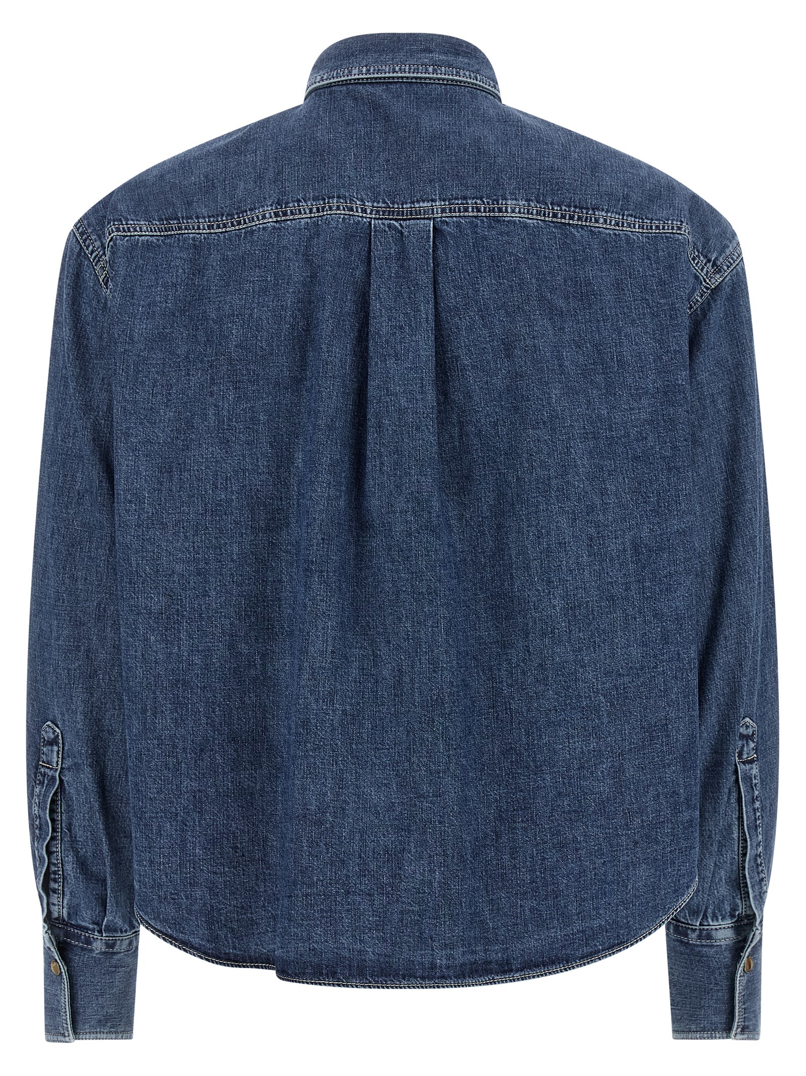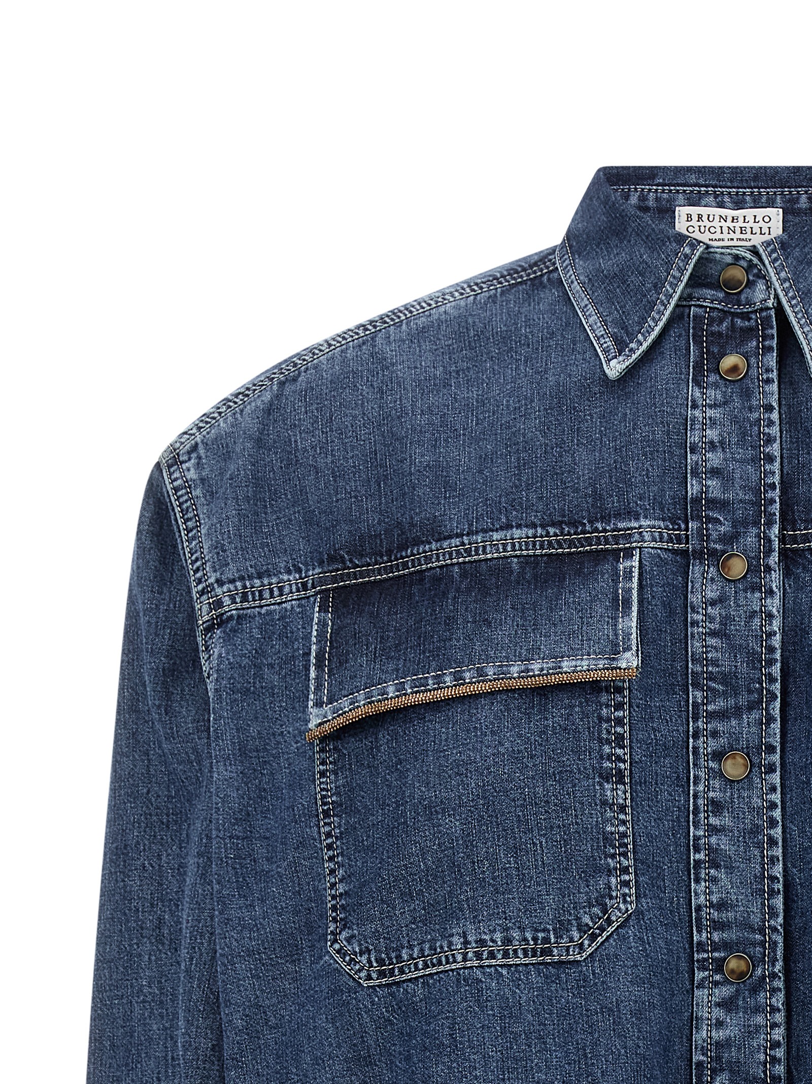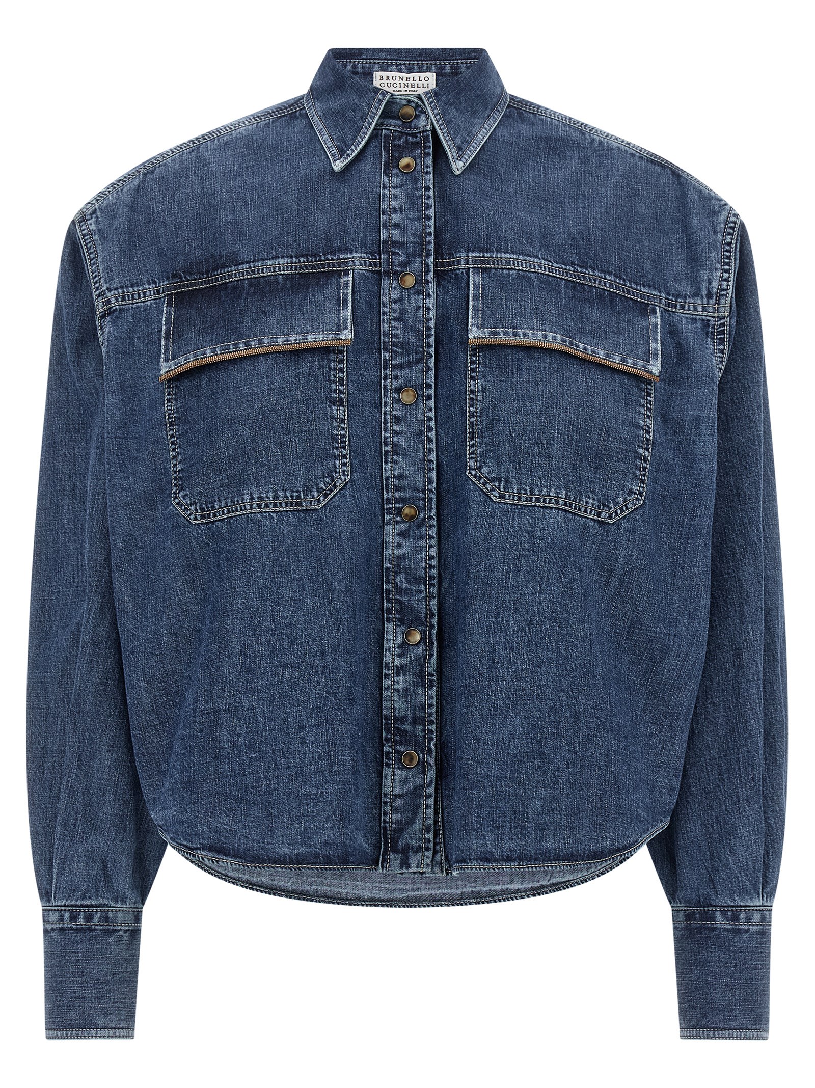 Lightweight denim shirt, Contrasting stitching, Slightly cropped fit, ‘shiny pockets’ with monile detail on the flap, Classic pointed collar, Front placket closure with snap buttons, Long sleeves with cuffs and dropped shoulders, Rounded and asymmetrical hem.