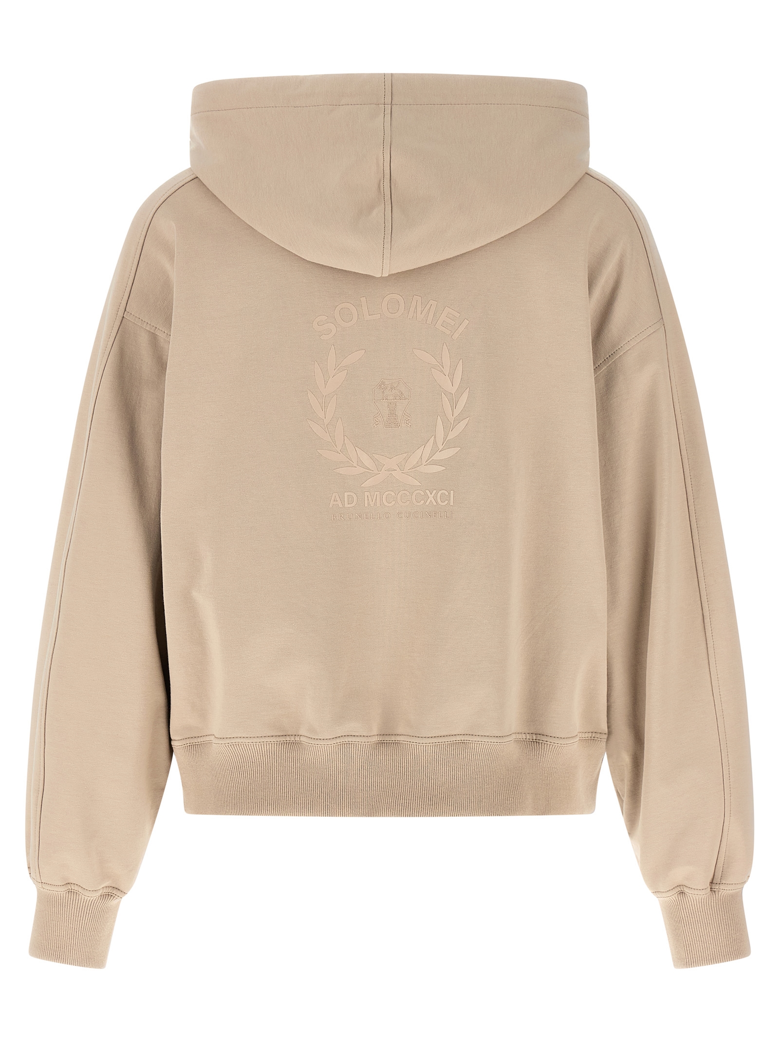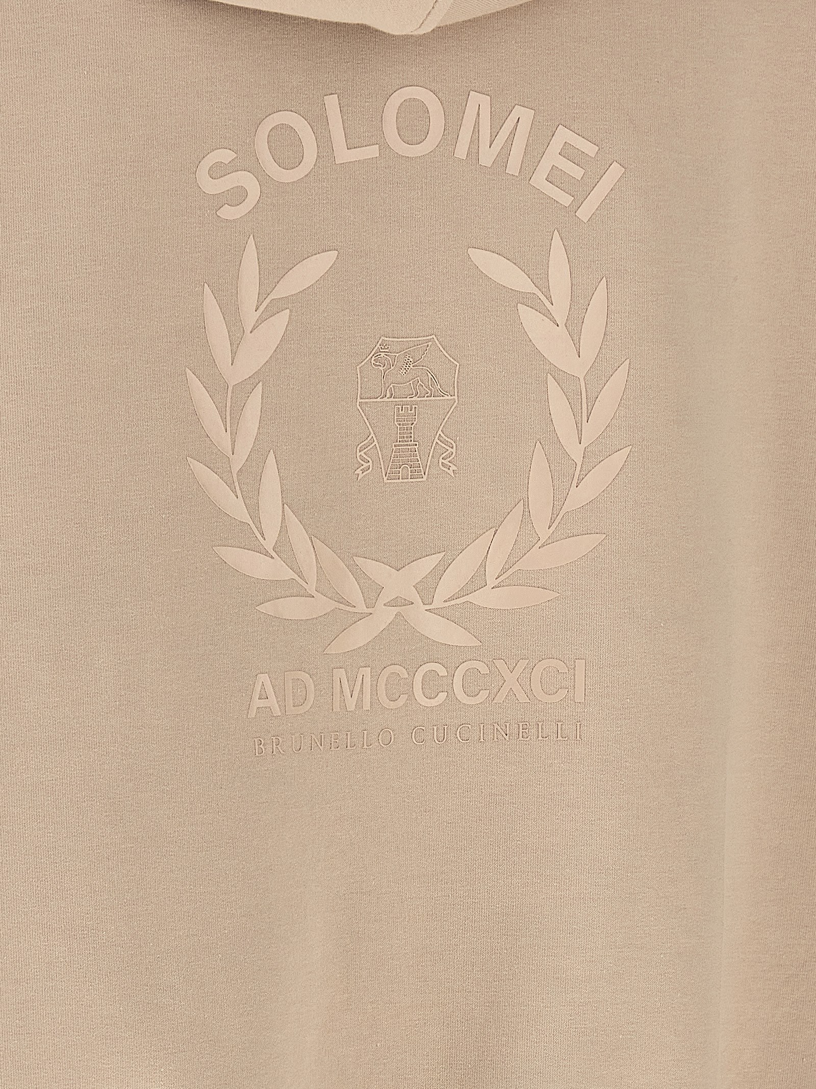 Lightweight stretch cotton hoodie with tone-on-tone ‘solomei ad mcccxci’ print on the back, Front zip closure, Pockets, Long sleeves with cuffs and dropped shoulders.