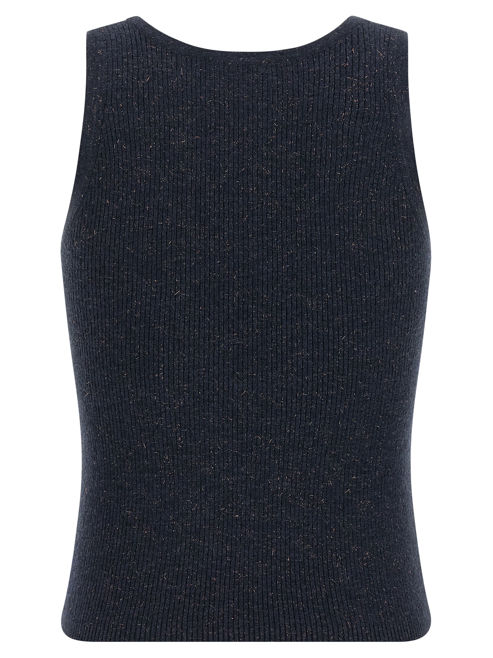 ‘sparkling’ ribbed cashmere tank top woven with lamé silt and a wide round neckline at the front. Size and Fit – Slim fit