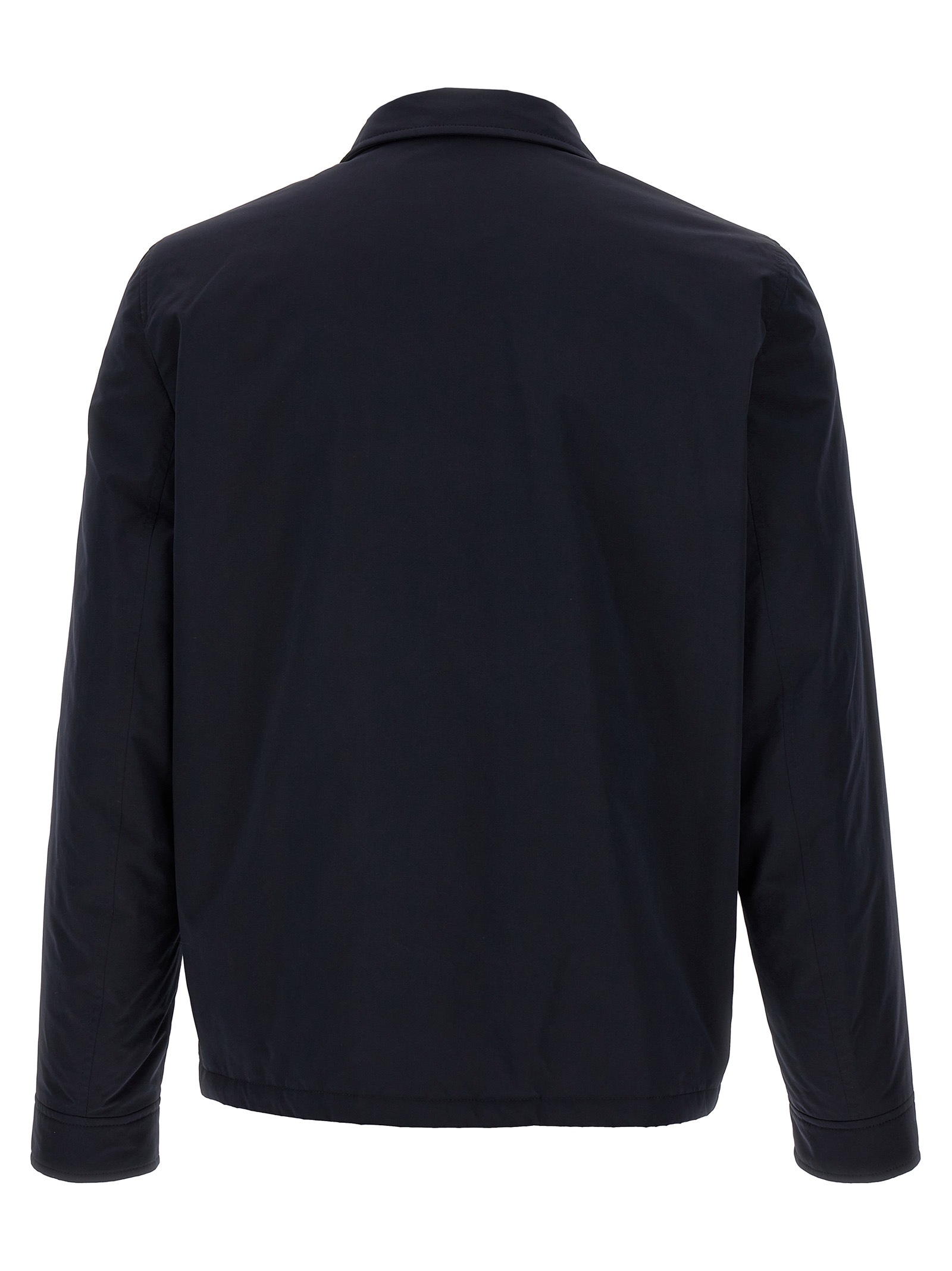 Water-repellent padded fabric jacket, snap button closure, long cuffed sleeves, pockets.