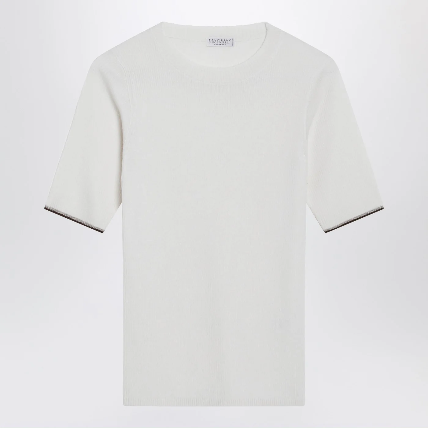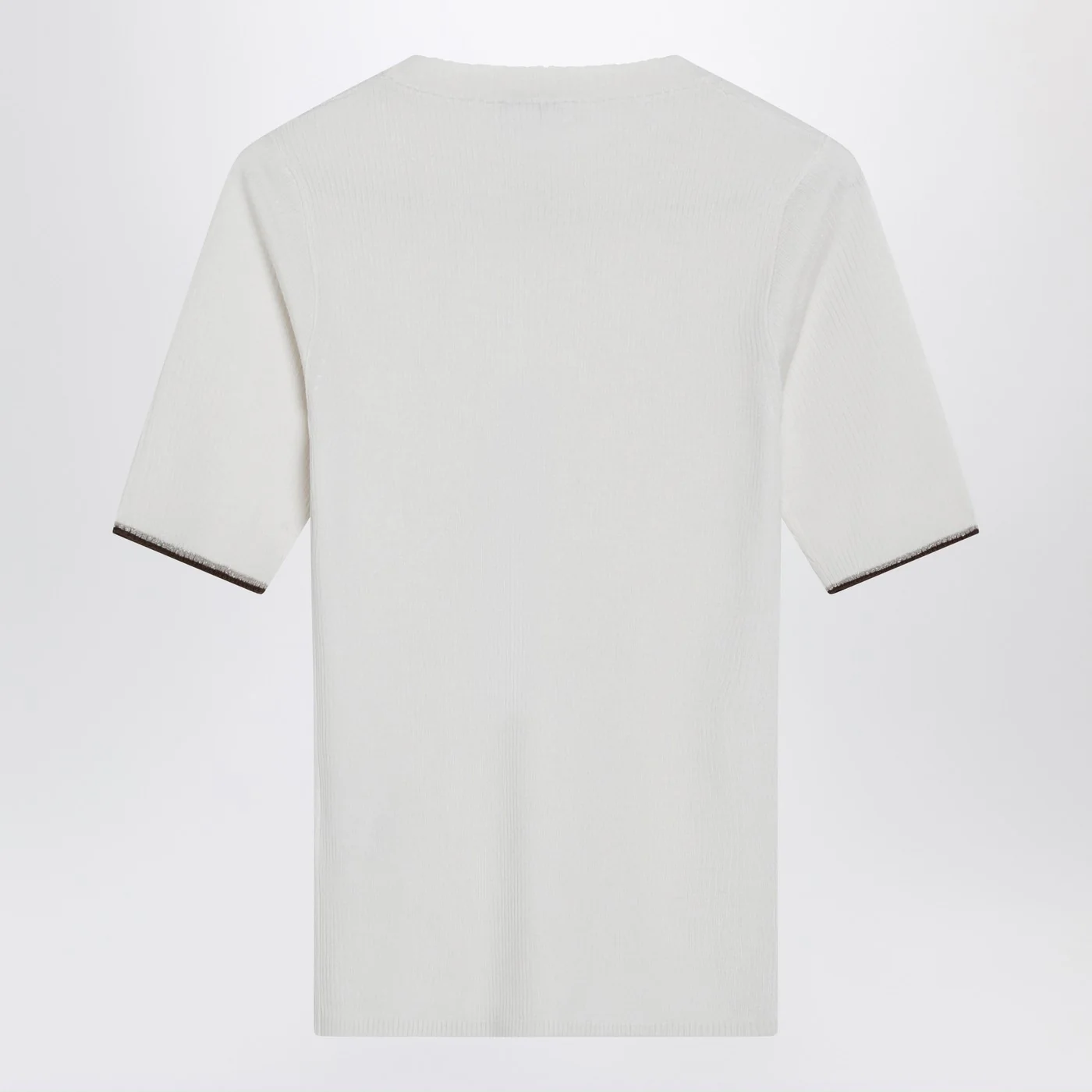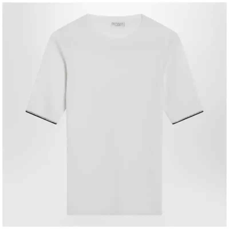 Crew neck sweater by Brunello Cucinelli in white cotton and silk blend Short sleeves with trim featuring a thin shiny thread Ribbed design. Size and Fit – Model wears size S Model measurements: Height: 182 cm Chest: 79 cm Waist: 62 cm Hips: 90 cm
