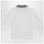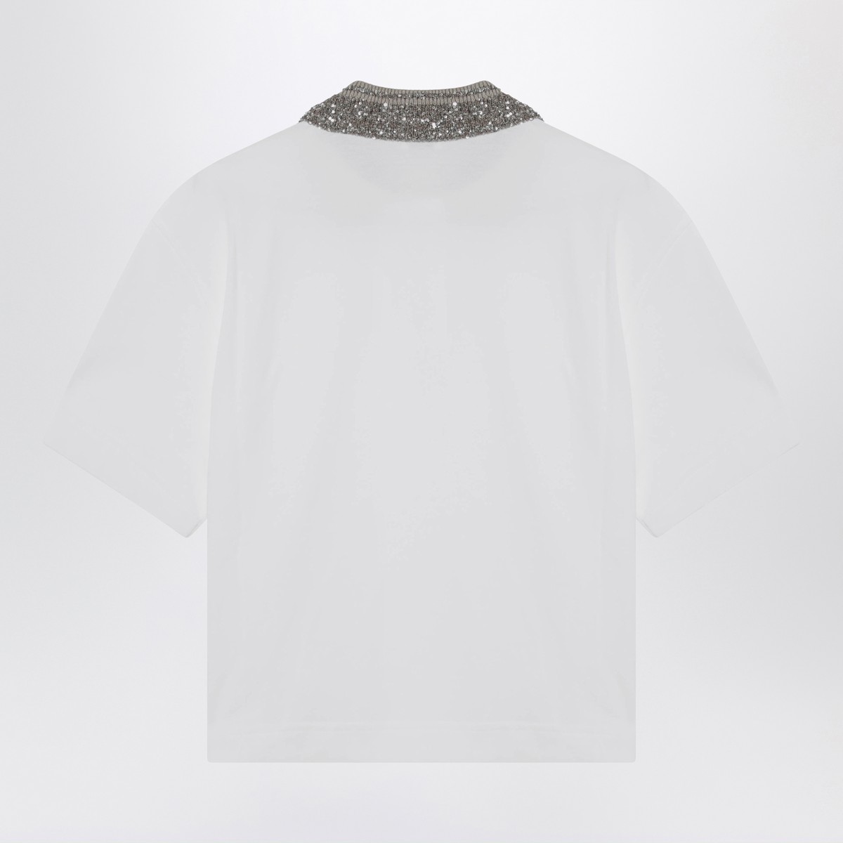 Brunello Cucinelli white cotton jersey polo shirt, featuring a ribbed knit collar embellished with sequined embroidery, front button placket, and short sleeves.