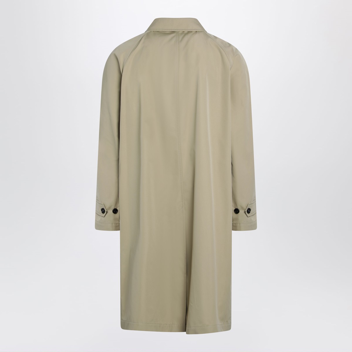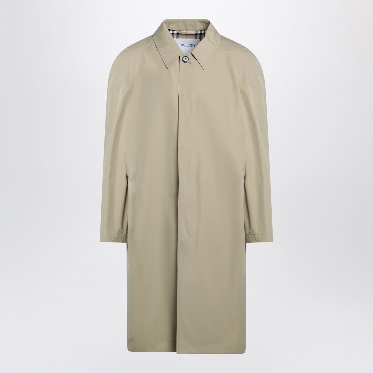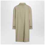 Beige cotton overcoat by Burberry, featuring concealed single-breasted button closure, two side welt pockets, long sleeves with buttoned tab cuffs, back vent, and Check pattern undercollar.