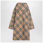 Beige Burberry poncho with all-over Check pattern, featuring a hood with drawstring, front zip, a kangaroo pocket with Equestrian Knight Design logo, wide sleeves, and a hem with drawstring.