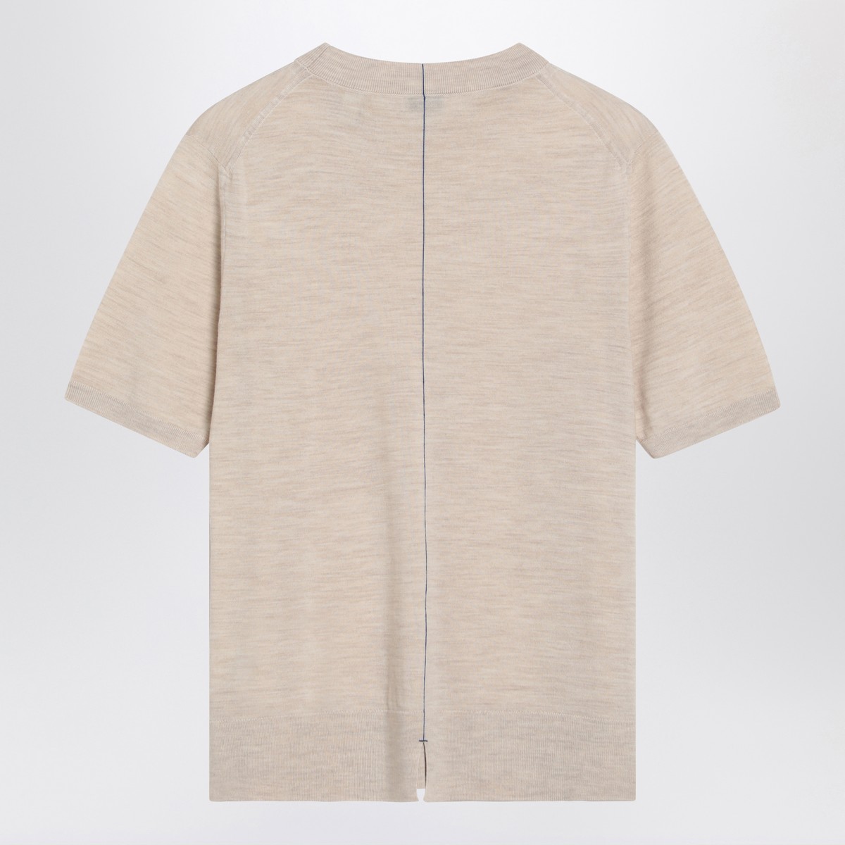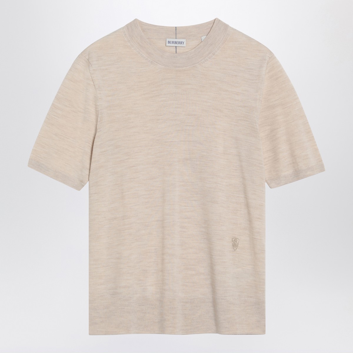 Beige wool crew neck sweater by Burberry, featuring short sleeves, a small tone-on-tone logo embroidery on the front, ribbed edges, and a back detail with a slit.