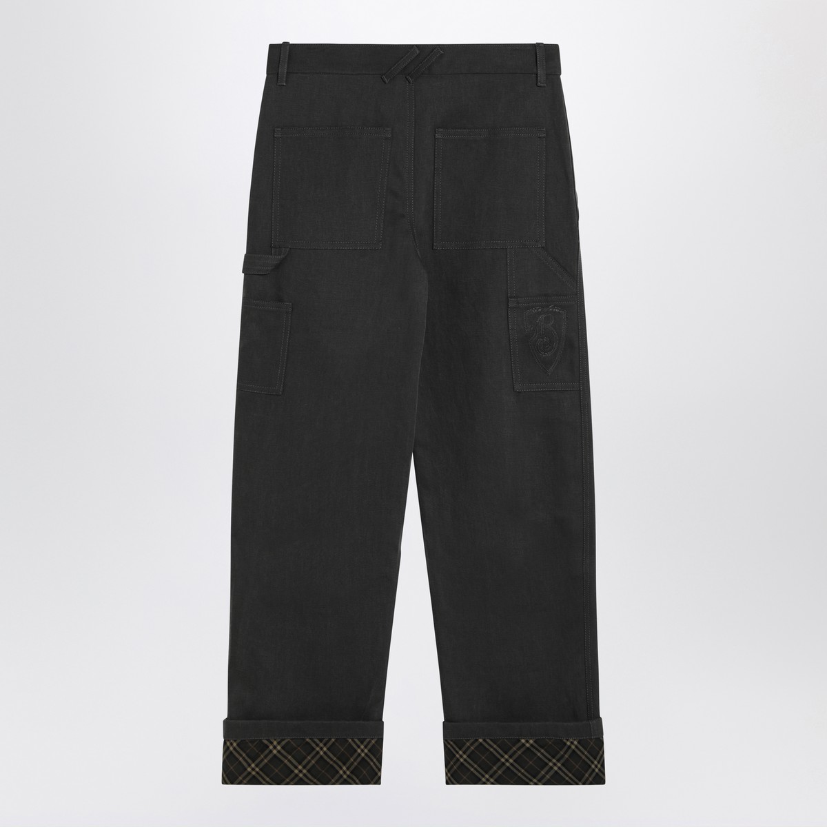 Black cotton Burberry trousers, featuring front zip and button fastening, waist loops, two side welt pockets, two cargo pockets, one of which has tone-on-tone logo embroidery, two patch pockets on the back, and turn-ups at the bottom of the leg with Check pattern.