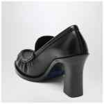 Loafer by Burberry in black calfskin, characterized by round toe with stitching, plaque with Knight Stamp enamelled on the front, quilted leather insole, wide heel and leather sole with contrasting Equestrian Knight Design.