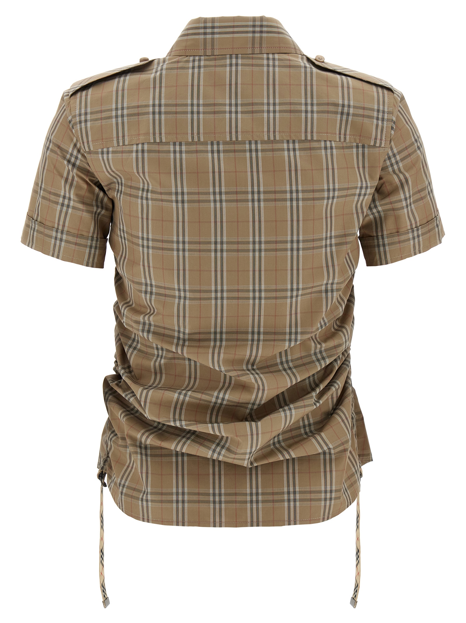 Check-print cotton shirt, collar, front button closure, curled detail on the sides with tape, short sleeves.