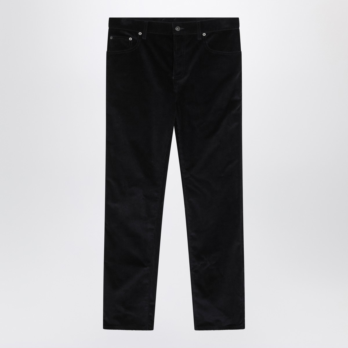 Burberry dark blue cotton corduroy trousers, featuring zip and button closure, belt loops, five-pocket design, back logo patch, and slim fit.