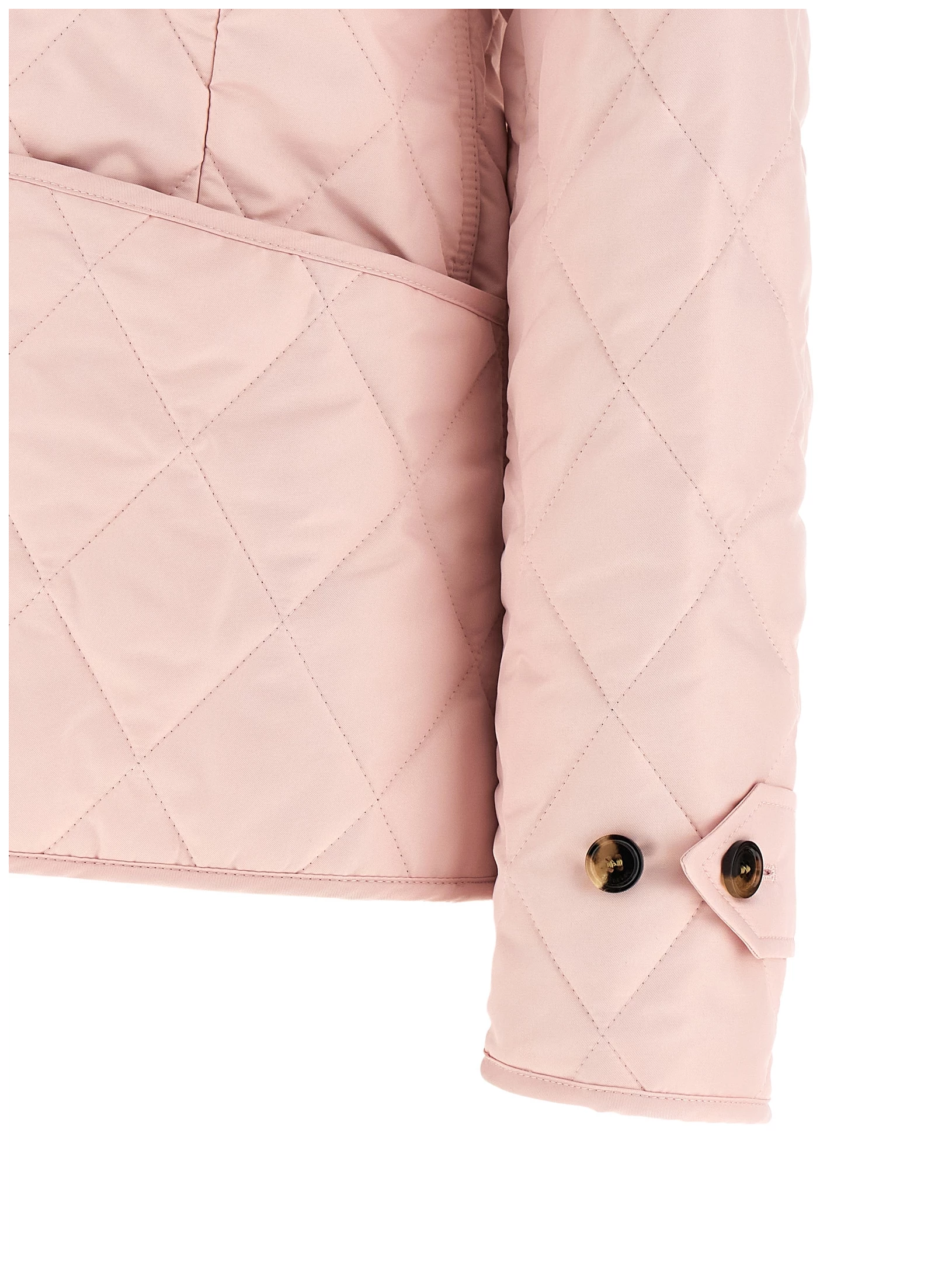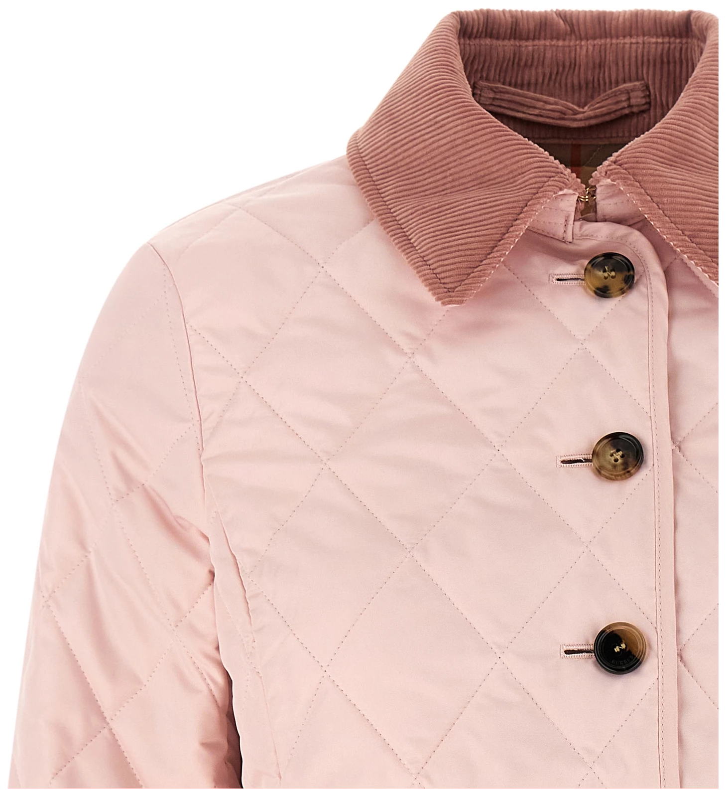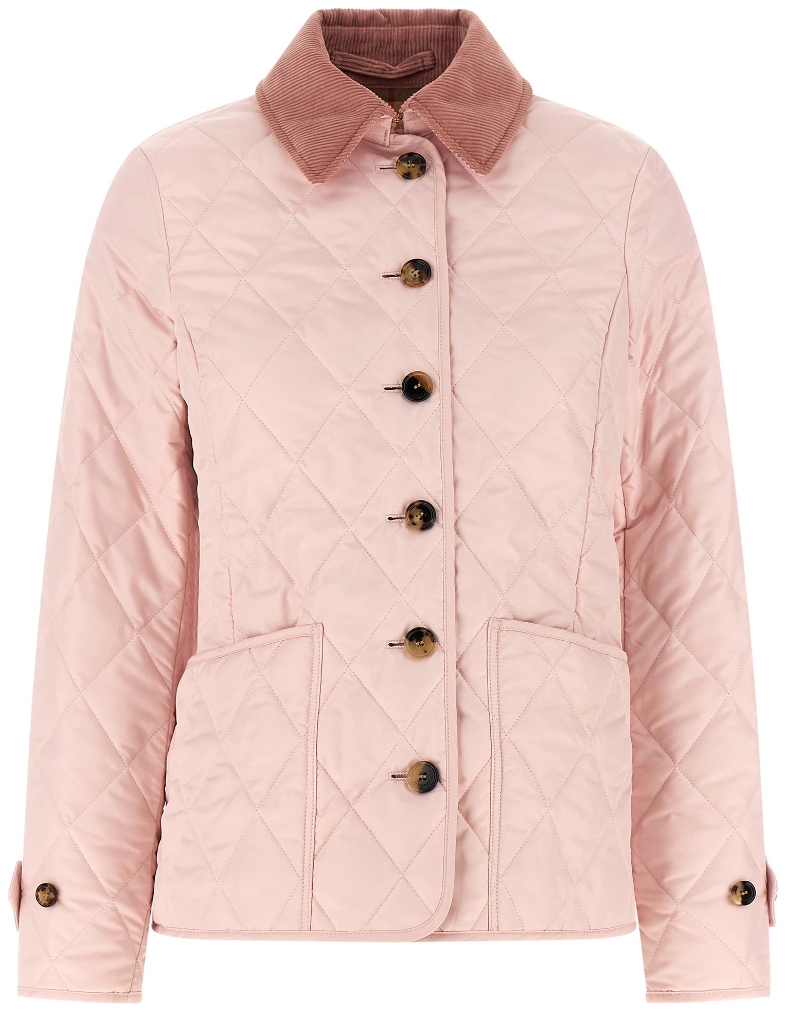 Fernleigh’ quilted nylon jacket, Burberry check lining, Tonal corduroy shirt collar, Chinstrap, Front horn button closure, Patch pockets, Long sleeves with adjustable and foldable cuffs.